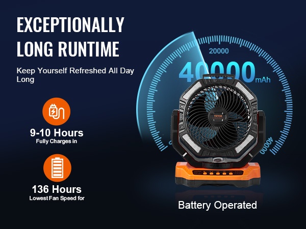 Sisäänrakennettu suuren kapasiteetin akku hyödyntää nopeaa lataustekniikkaa. Täyteen lataus kestää noin 9–10 tuntia, minkä jälkeen tuuletin voi toimia jopa 72 tuntia alimmalla nopeudella. Tämä vähentää tarvetta jatkuvaan lataamiseen esimerkiksi retkillä tai sähkökatkosten aikana.