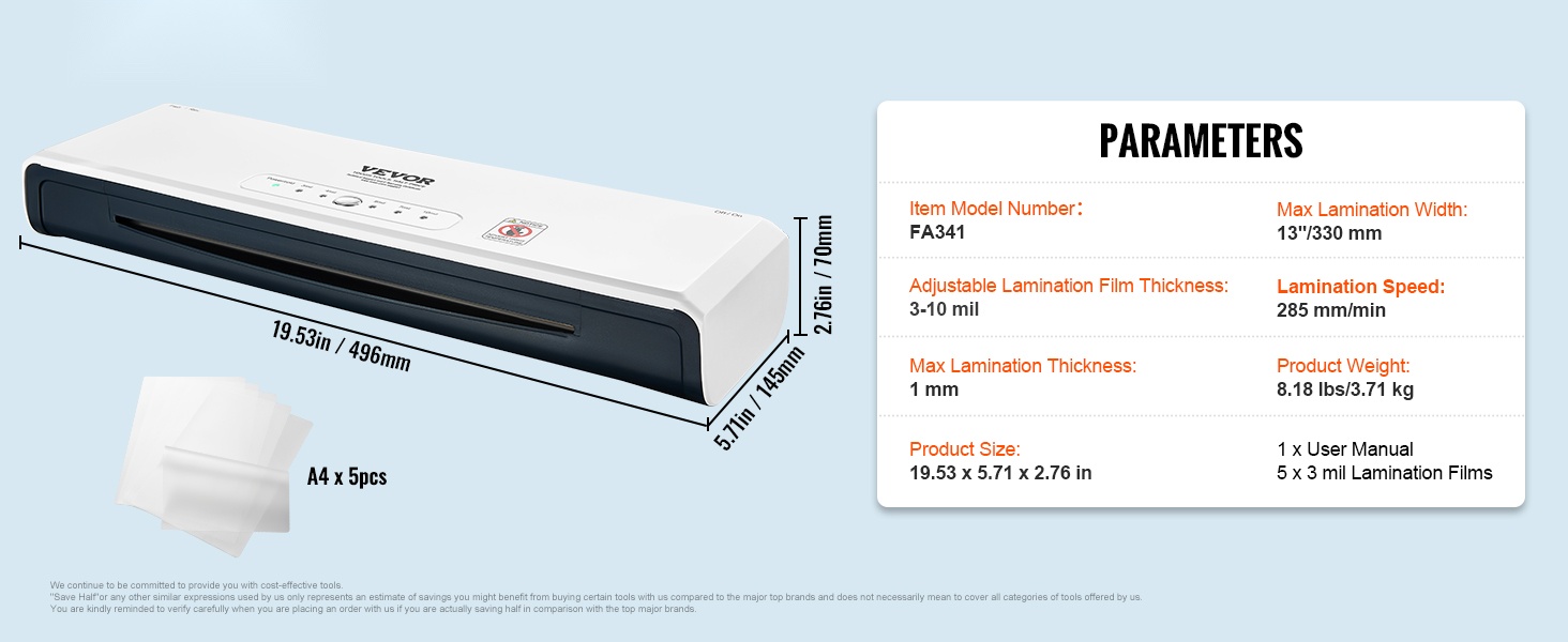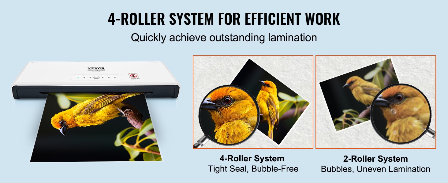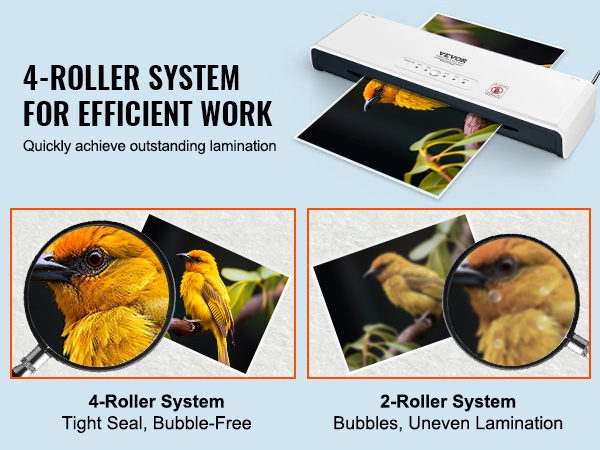 Tämä 2-in-1 kuuma- ja kylmälaminointilaite tarjoaa helpon yhden painikkeen käytön ja nopean esilämmityksen, jolloin laminointi onnistuu noin 1–2 minuutissa. Laminoidut sivut pysyvät sileinä, vedenkestävinä ja pölyltä suojattuina. 4-rullainen rakenne soveltuu hyvin esimerkiksi taideteoksille, todistuksille, henkilökorteille ja valokuville.