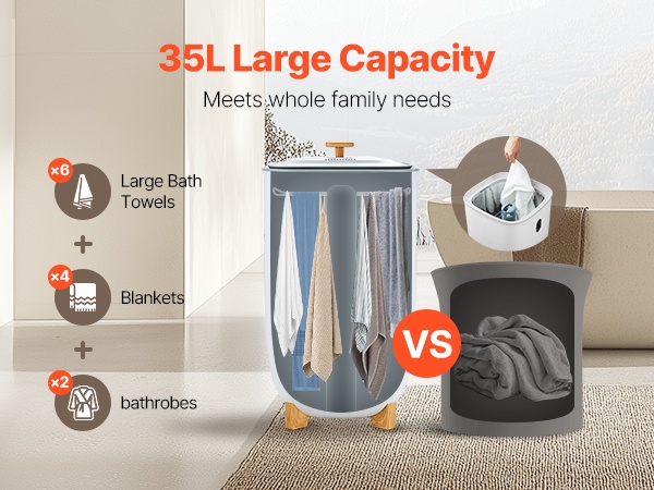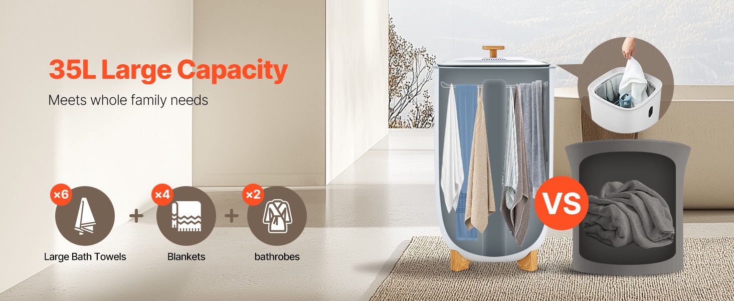 Älykäs pyyhelämmitin vetää jopa kaksi suurta kylpypyyhettä (70 x 40 in / 177.8 x 101.6 cm) sekä esimerkiksi kylpytakkeja, peittoja ja pyjamia. Yksi lämmityskerta riittää useammalle käyttäjälle, mikä vähentää tarvetta toistuviin lämmityskertoihin erityisesti isommissa perheissä.