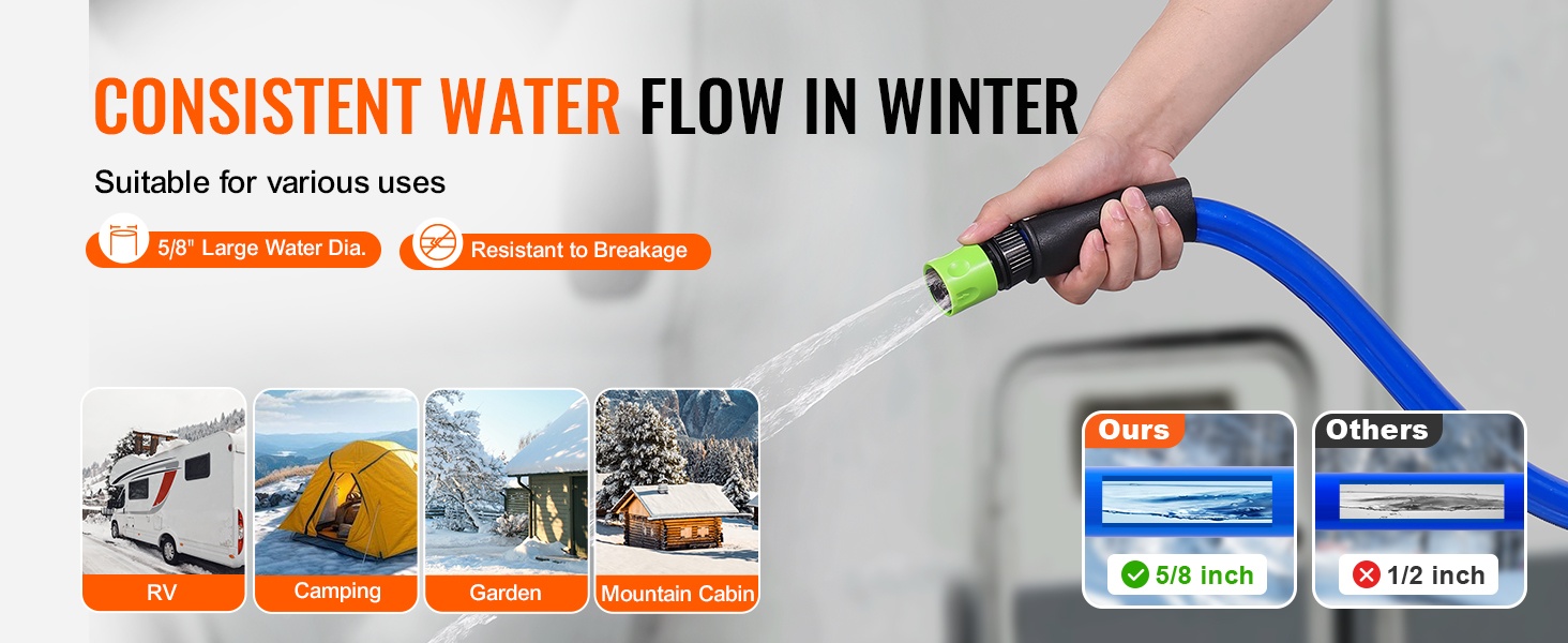 Talviöinä tavalliset letkut jäätyvät helposti matalissa lämpötiloissa. Tällä lämmitettävällä vesiletkulla voit käyttää vettä normaalisti aina lämpötilaan -45°F / -42.7℃ asti esimerkiksi matkailuautossa tai leiriytyessä.