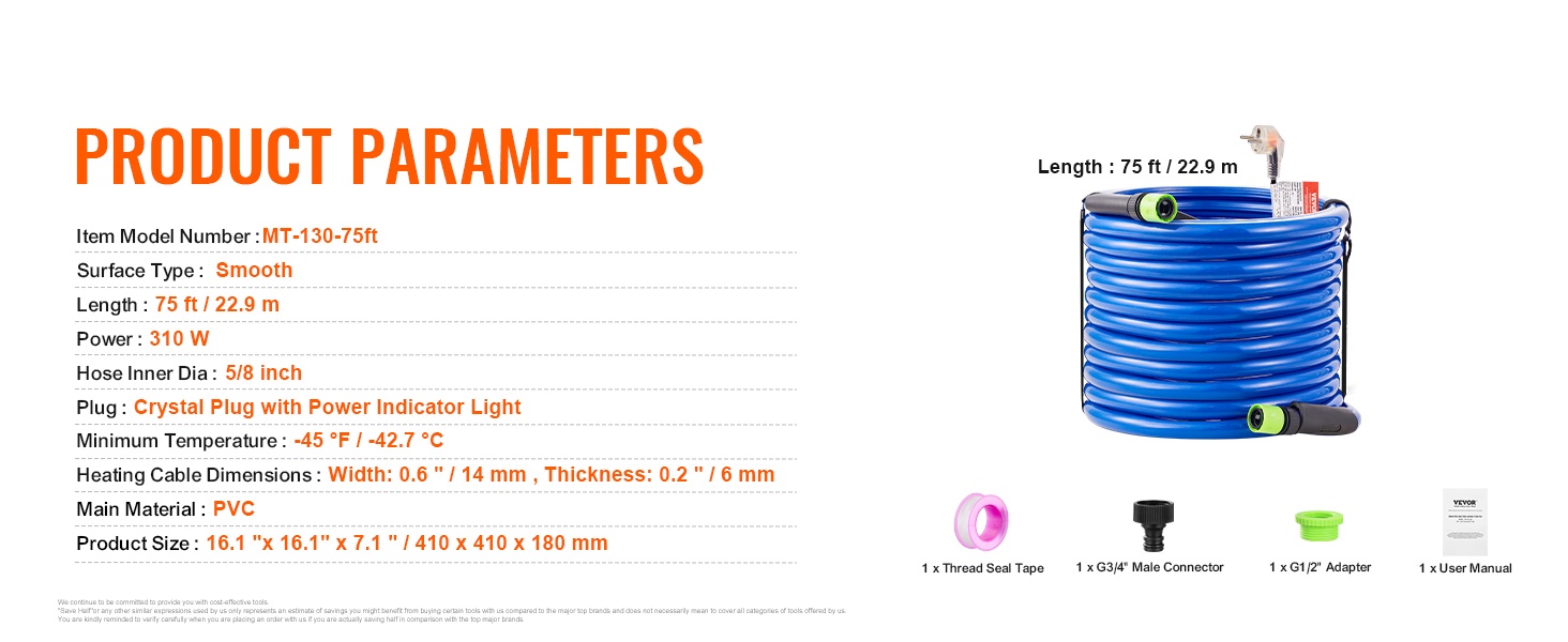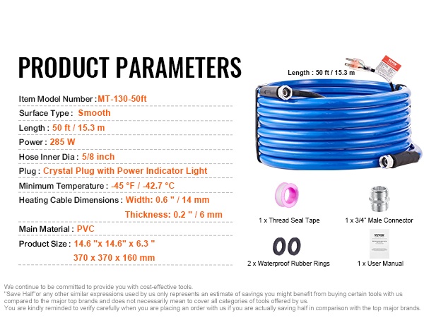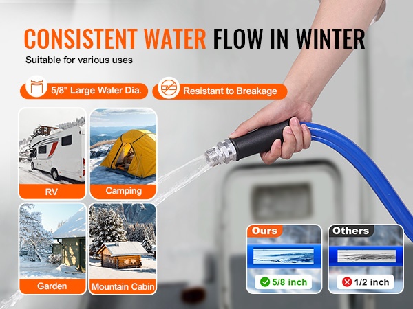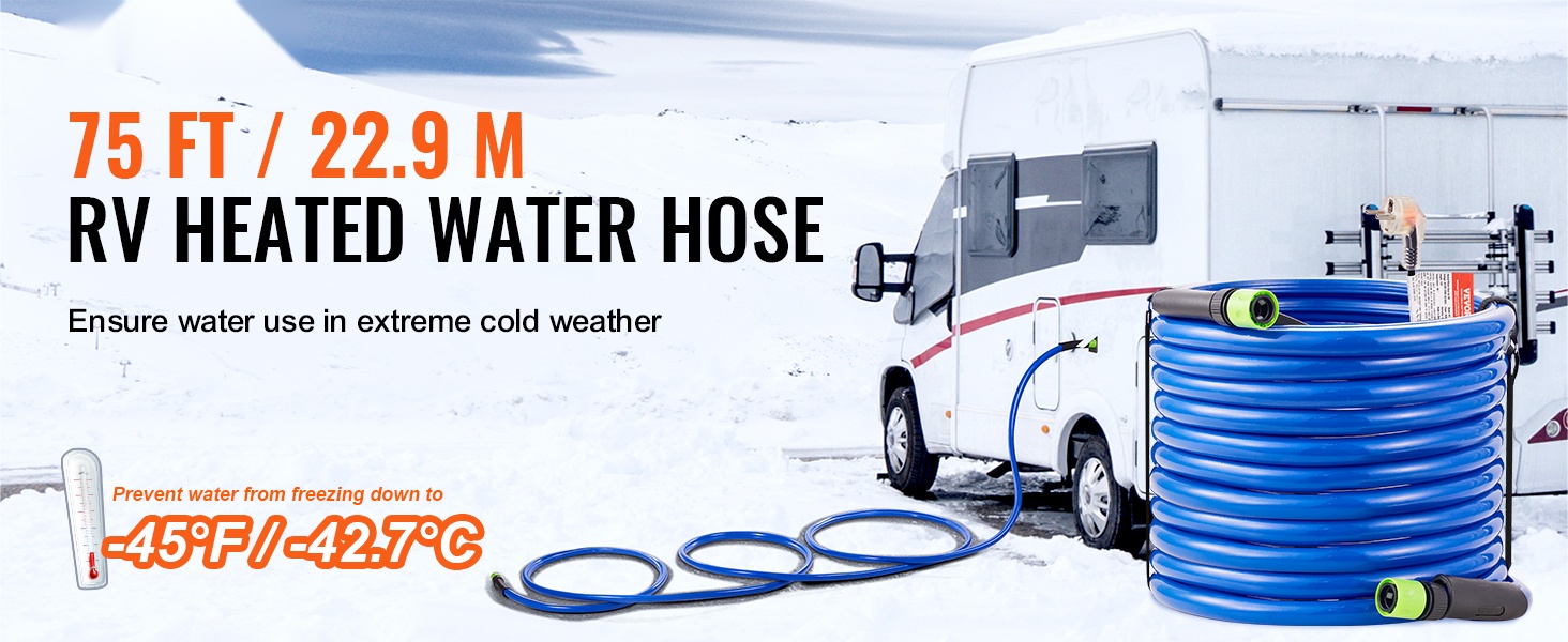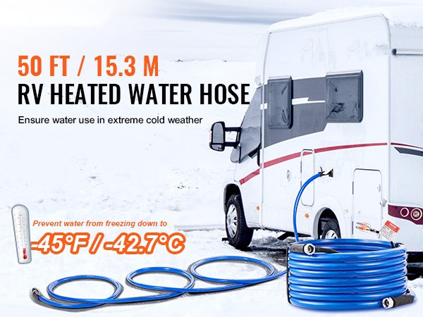 Tämä lämmitettävä juomavesiletku varmistaa vedensaannin myös kylminä talviöinä. Letku pysyy sulana jopa lämpötilassa -45°F / -42.7℃, joten vettä voi käyttää normaalisti esimerkiksi matkailuautossa, leirinnässä tai pihalla talvella.