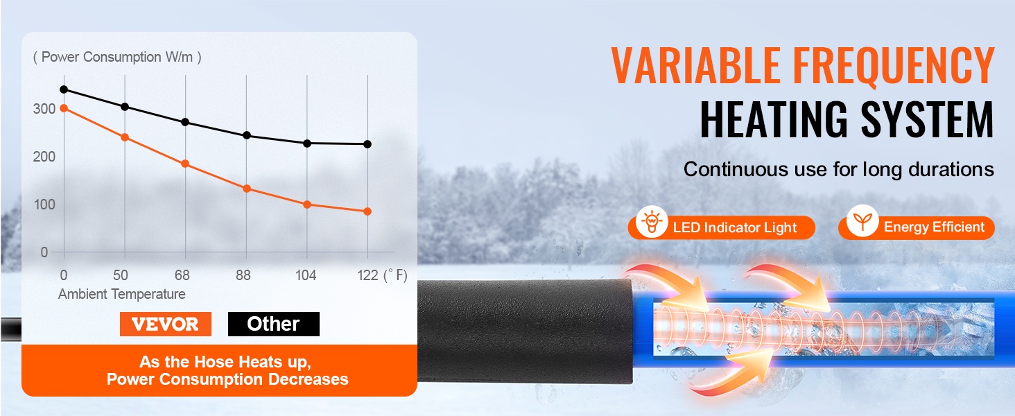 Leveä lämmitysjohto ja automaattinen, muuttuvataajuuksinen lämmitysjärjestelmä estävät letkun jäätymisen ja pitävät energiankulutuksen kurissa. Järjestelmä ei ylikuumene ja toimii myös silloin, kun letkussa ei ole vettä. Sileä ulkopinta nopeuttaa lämmön leviämistä letkun pinnalle.