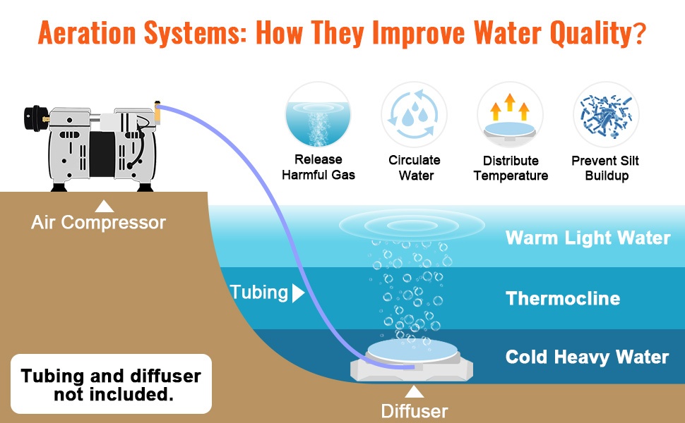 Vankka rakenne ja mukana tulevat tarvikkeet helpottavat asennusta ja käyttöä. Järjestelmää voidaan käyttää hajujen vähentämiseen, levän kasvun hillitsemiseen, pohjamudan vähenemiseen ja kalojen elinolosuhteiden parantamiseen.