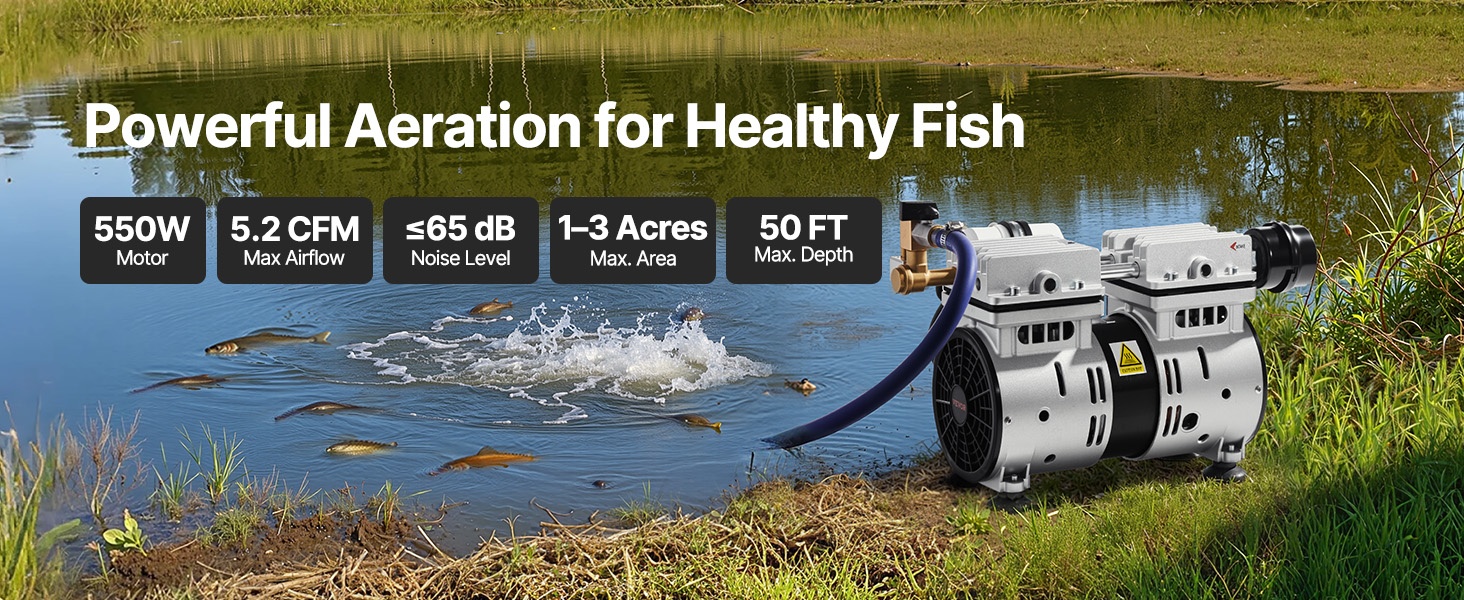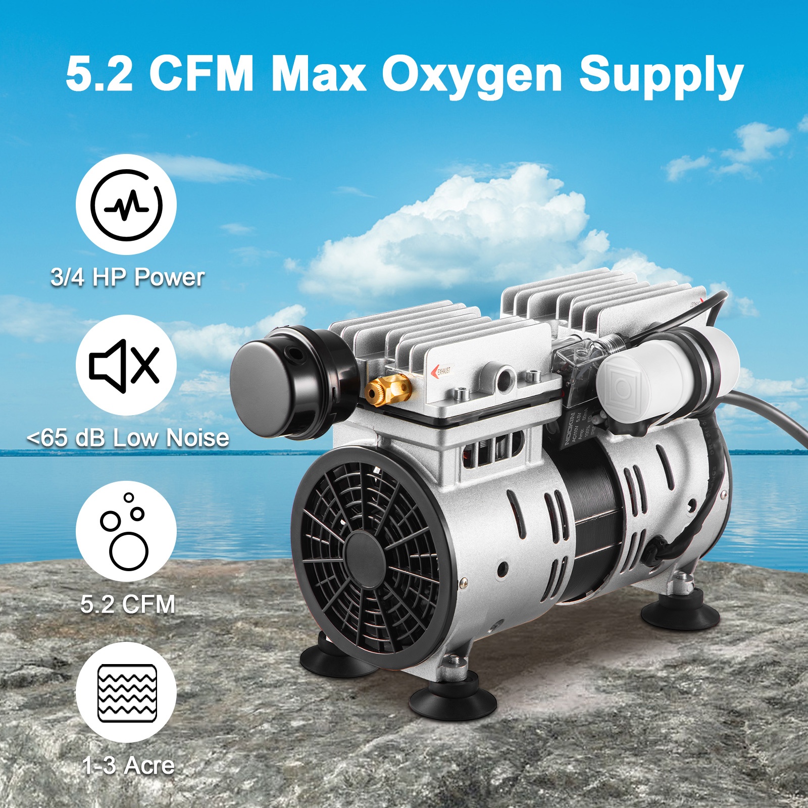 Lampeaerointilaite kykenee ilmastoimaan 1-3 eekkerin, jopa 50' syviä lampia. Kompressori pumppaa enintään 5.2CFM ilmaa, mikä parantaa veden happipitoisuutta koko vesimassassa.