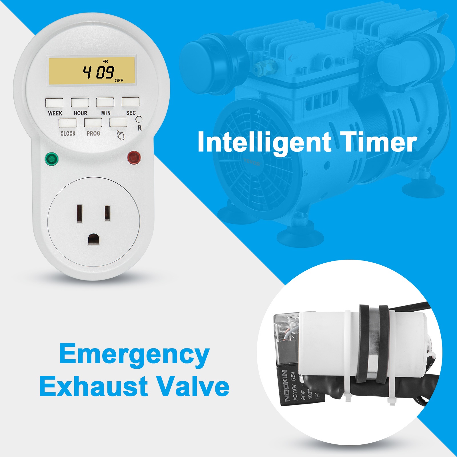 Järjestelmässä on ajastin ja turvaventtiili, jotka ehkäisevät moottorin ylikuumenemista ja pidentävät käyttöikää. Ajastimen avulla käyttöaikaa voidaan rajata ja näin säästää energiaa.
