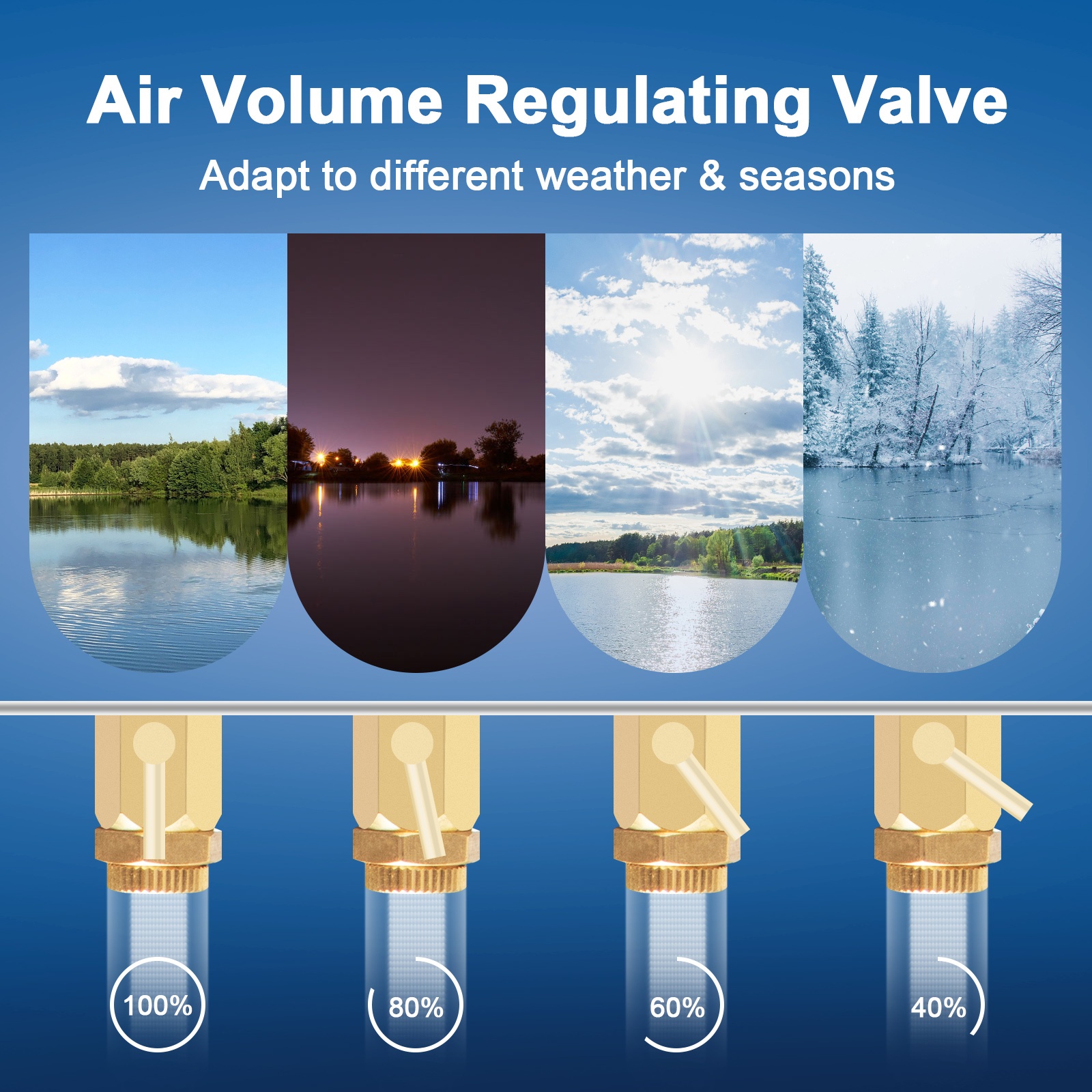 Ilmamäärän säätöventtiilin avulla lampeaerointipaketti mukautuu eri sääolosuhteisiin ja veden hapentarpeeseen. Ilmavirtaa voidaan säätää helposti venttiiliä kääntämällä.