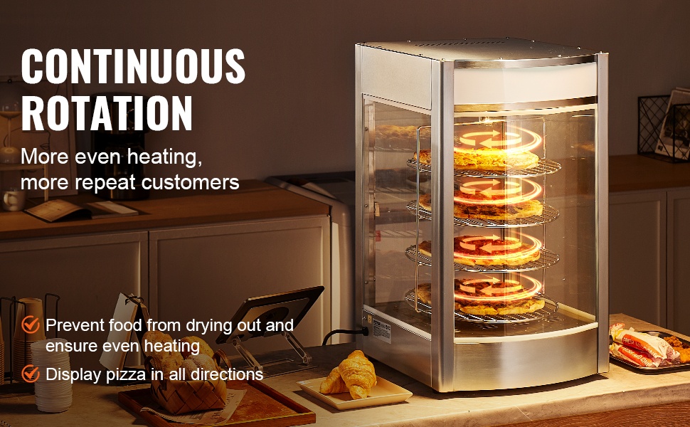 Pyörivä kiertorakenne varmistaa tasaisen lämmityksen, jolloin pinta pysyy miellyttävän rapeana ilman liiallista rasvaisuutta. Sisävalaistus korostaa esillä olevia tuotteita ja parantaa näkyvyyttä.