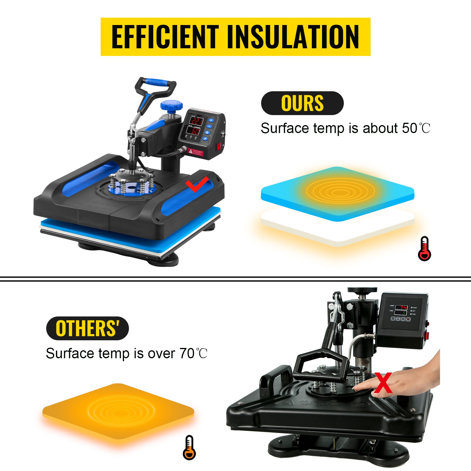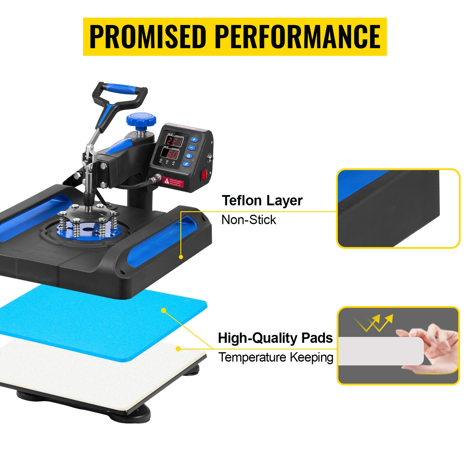 Tämä 15 x 15 -lämpöprässi (38 x 38 cm) käyttää kaksikerroksista eristysteknologiaa parantamaan siirtotyön laatua ja turvallisuutta. Luotettava ohjain ja tarkka lämpötilansäätö auttavat pitämään tulokset tasaisina, olipa kyseessä T-paita, lakki, muki tai lautanen.