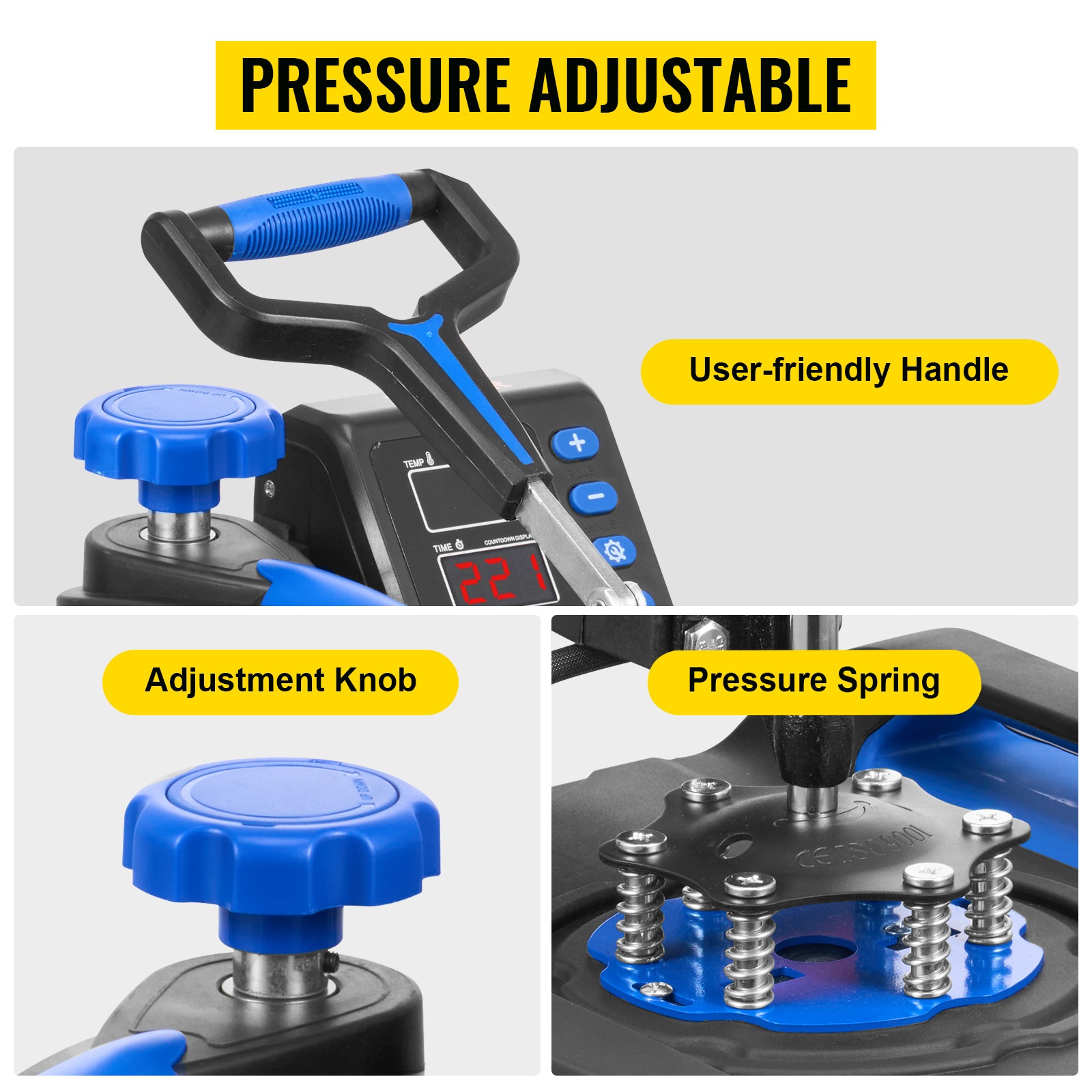Kantokahva helpottaa laitteen siirtämistä. Säädettävä ruuvi mahdollistaa korkeuden ja puristuspaineen säätämisen. Vankka alusta varmistaa vakaan käytön.