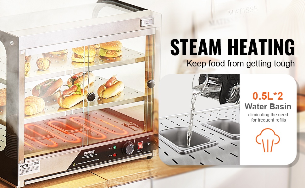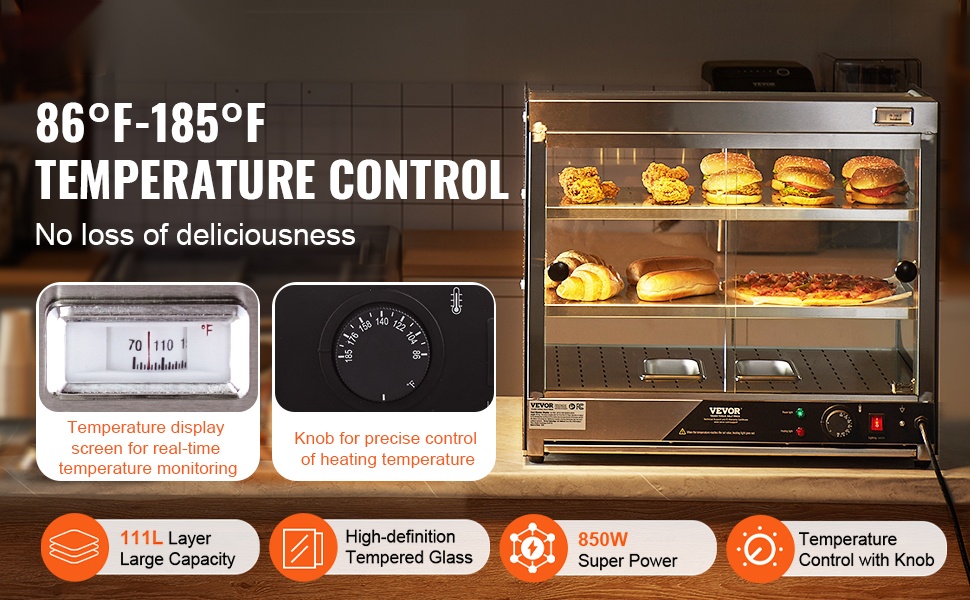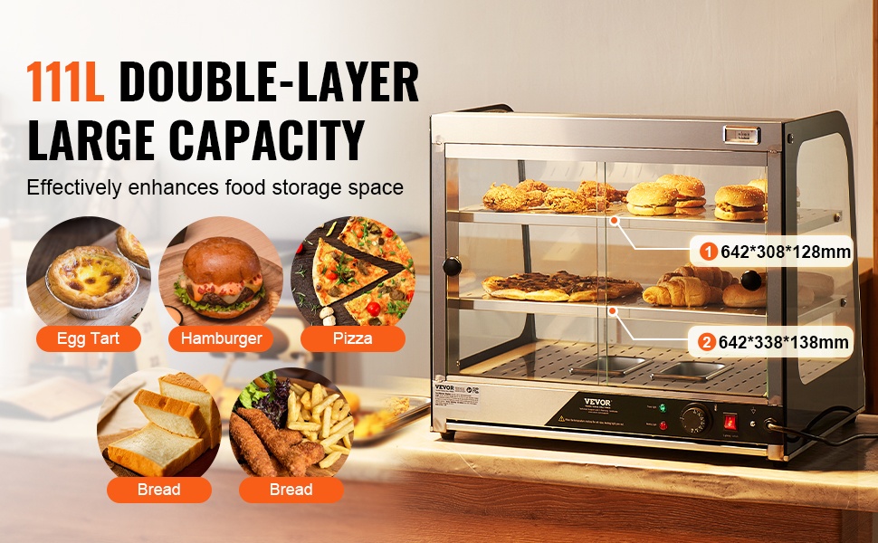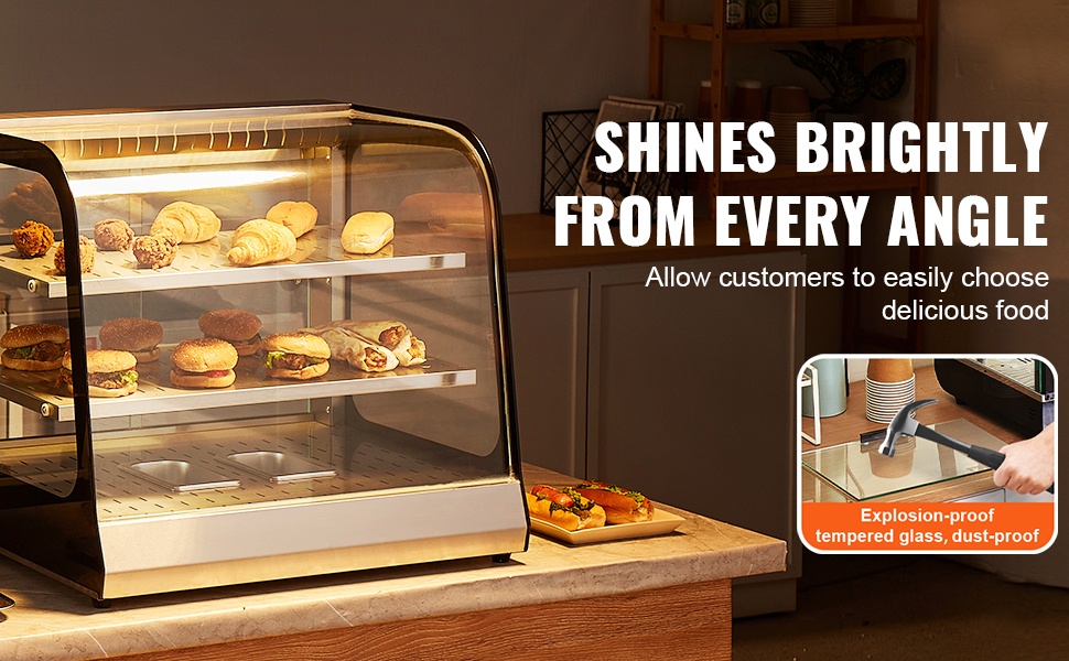 Lämpövitriinissä on 3 säädettävää hyllyä, joiden avulla tilan voi mukauttaa eri tuotteille, kuten pizzoille, hampurilaisille, friteeratulle kanalle, hot dogeille ja leivonnaisille. Rakenne soveltuu hyvin leipomoihin, kahviloihin, buffetteihin ja pikaruokapisteisiin.