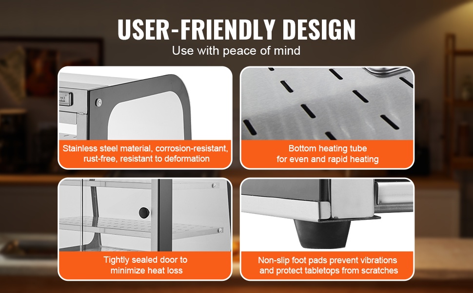 Laite on valmistettu korkealaatuisesta ruostumattomasta teräksestä ja karkaistusta lasista. Se on suunniteltu ruoan lämmittämiseen ja esillepanoon, ja sisävalaistus tekee tuotteista paremmin näkyviä.