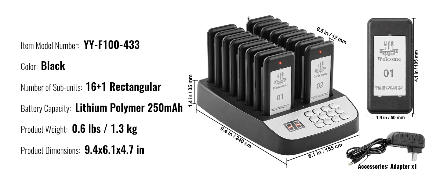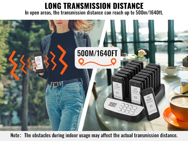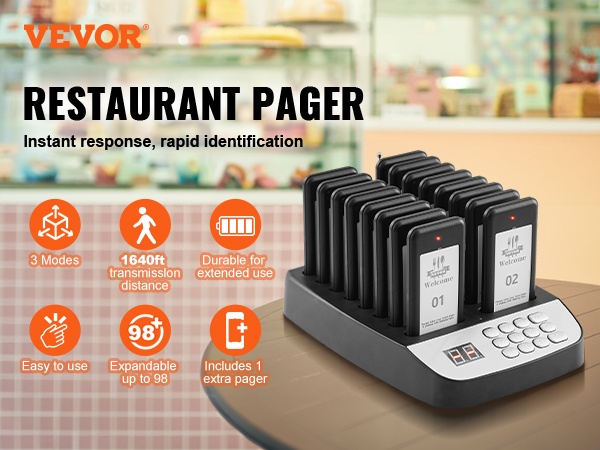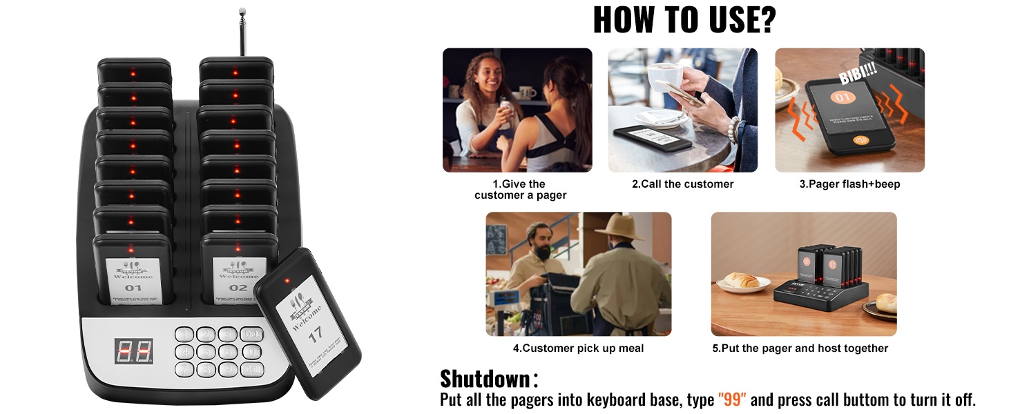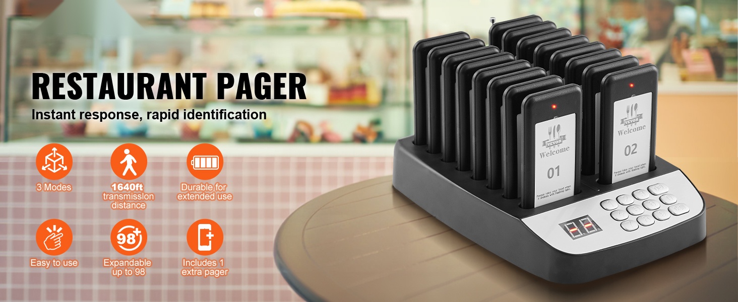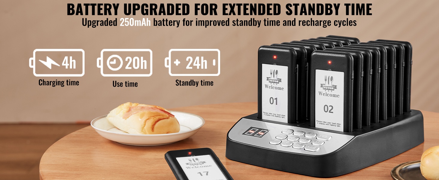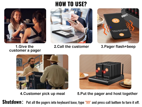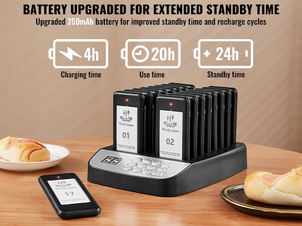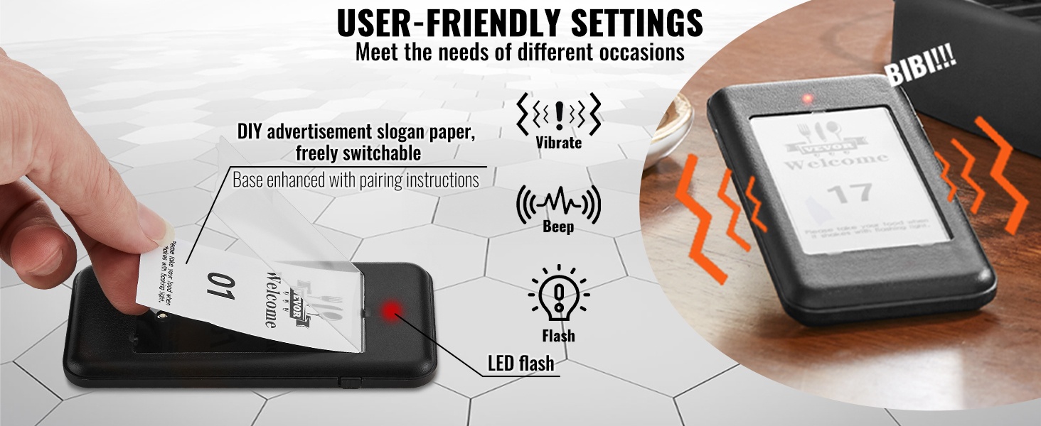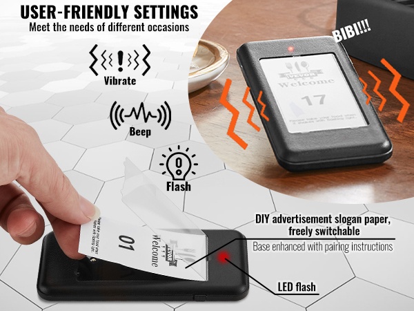 Jokaisessa hakulaitteessa on LED-valo, värinämoottori ja summeri. Näiden yhdistelmä varmistaa, että asiakas huomaa kutsun, vaikka ympäristö olisi meluisa. Kosketusnäppäimistö helpottaa numeroiden syöttöä, ja mukana oleva paritusohjetarra auttaa pitämään asetukset selkeinä.