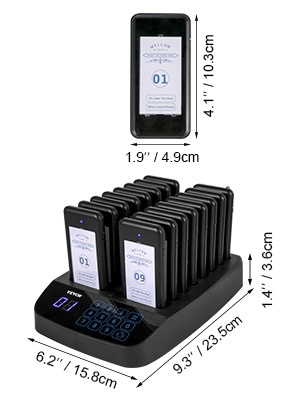 Tämä langaton jonotus- ja kutsujärjestelmä sisältää 1 kpl 98-kanavaisen näppäimistöaseman ja 16 kpl hakulaitteita. Asiakas saa numerolla varustetun hakulaitteen tilauksen yhteydessä, ja henkilökunta kutsuu asiakasta painamalla vastaavaa numeroa kosketusnäppäimistöstä. Hakuviesti välittyy värinän, valon ja äänimerkin avulla. Järjestelmä sopii ravintoloihin, kahviloihin, pikaruokapaikkoihin, ruokatoreille, klinikoille, seurakuntatiloihin, autokorjaamoihin ja muihin jonotustilanteisiin.