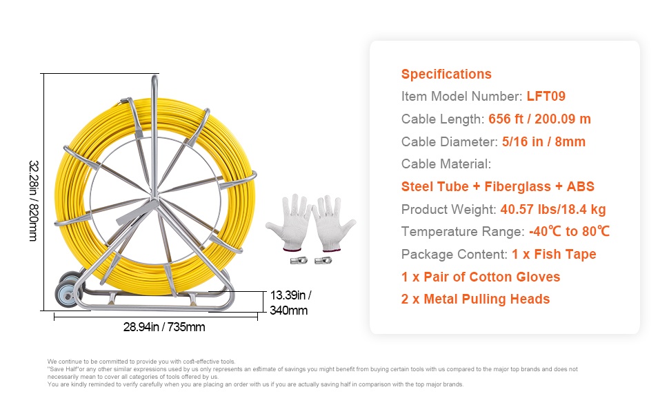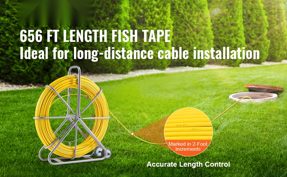 Lasikuituinen kaapelinvetoanastin pitkille vedoille. Pituus 656 ft / 200.09 m ja halkaisija 5/16 in / 7.94 mm mahdollistavat kaapeleiden vetämisen pitkin kanavia ja putkia myös vaativissa kohteissa. Johdossa on merkinnät joka 2 ft, mikä helpottaa pituuden arviointia työn aikana.