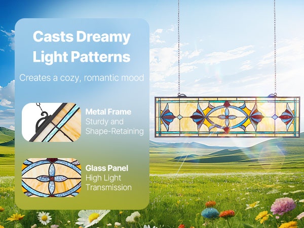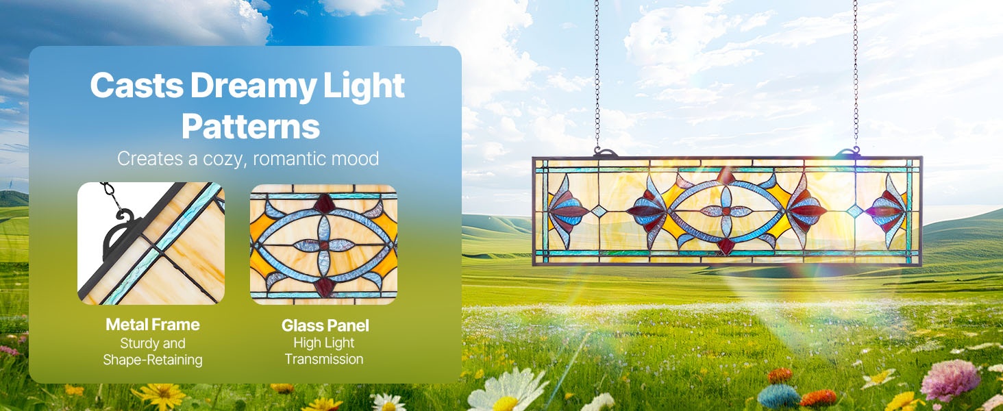 Vankka metallikehys tukee lasipaneelia ja auttaa estämään vääntymistä ja vaurioita. Läpinäkyvä, värillinen lasi päästää auringonvalon läpi ja muodostaa seinille ja lattialle värikkäitä heijastuksia, jotka luovat miellyttävän tunnelman.