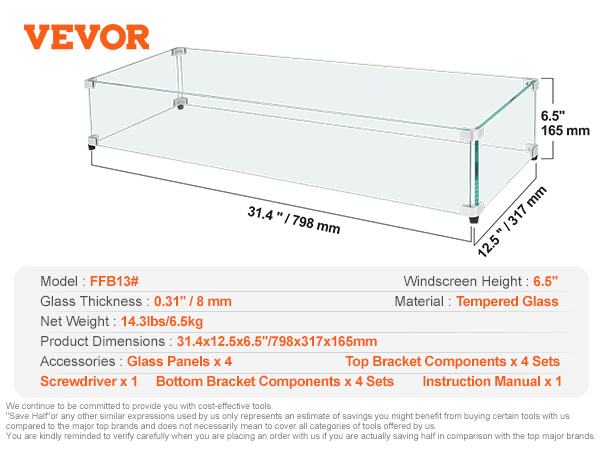 Lasinen tuulisuoja tulipöydälle FFB13, karkaistu lasi 8 mm, 798x317x165 mm