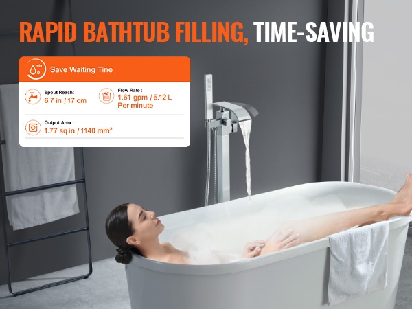 Virtausnopeus 1.61 gpm / 6.12 L minuutissa täyttää kylpyammeen lyhyessä ajassa. Vesiputousmainen juoksuputken muotoilu ohjaa veden tasaisena virtauksena ja pyrkii yhdistämään korkean virtaaman ja säästeliään vedenkäytön.