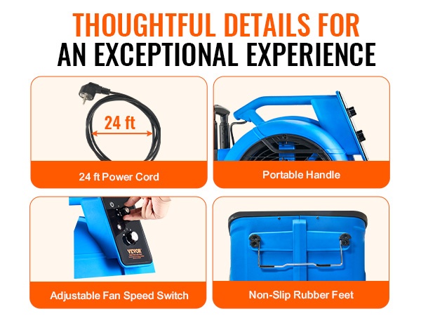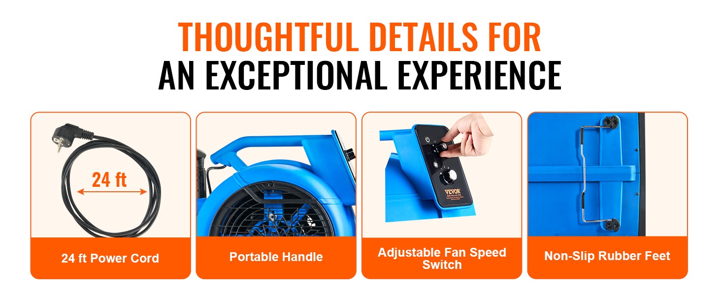 Lattiapuhallin kuivattaa lattiat ja matot nopeasti sekä poistaa kosteutta ja tunkkaisuutta. 3 säädettävää nopeutta mukautuvat eri tarpeisiin, ja pitkä virtajohto sekä kantokahva tekevät laitteesta helpon siirtää tilasta toiseen. Liukumattomat kumijalat pitävät puhaltimen tukevasti paikallaan käytön aikana.