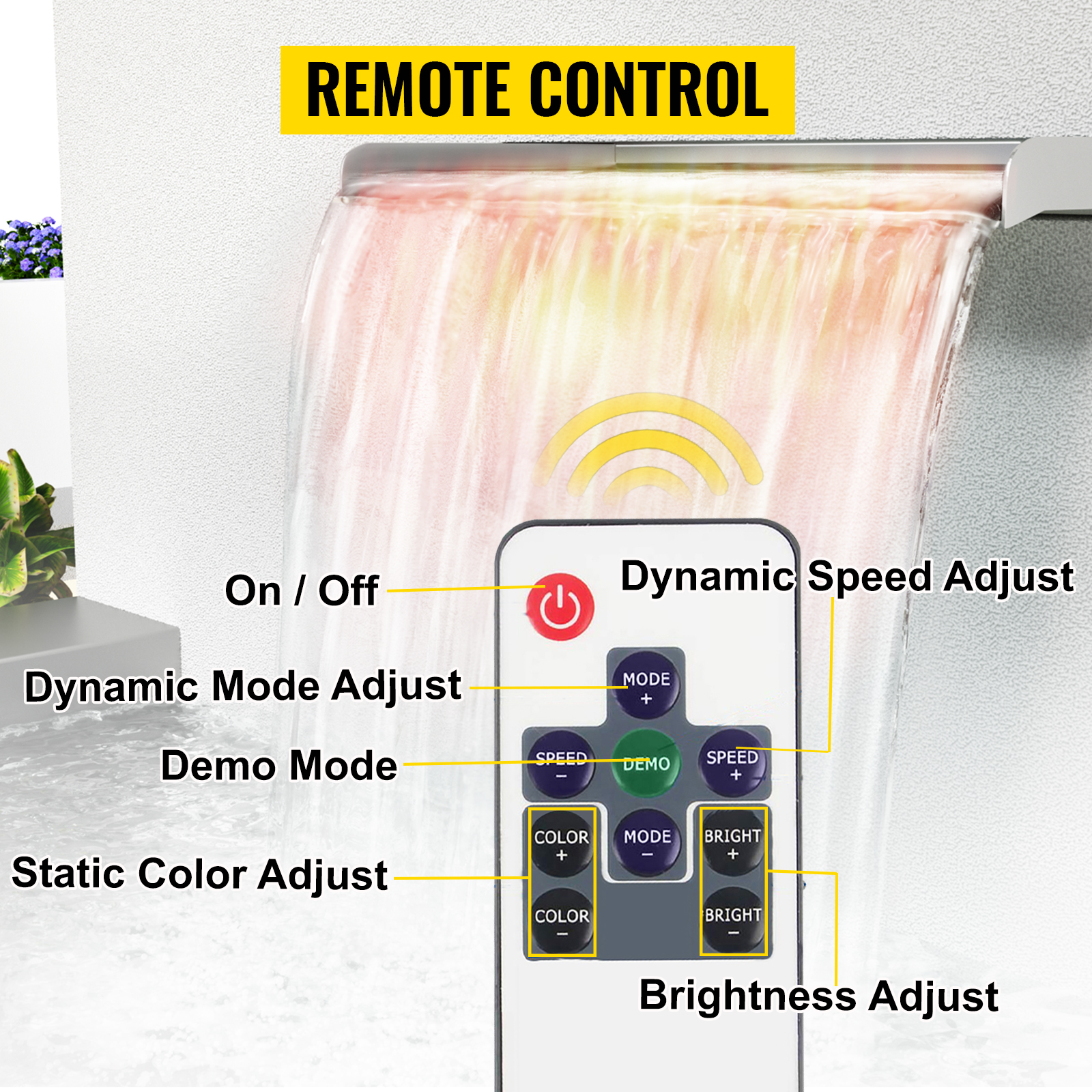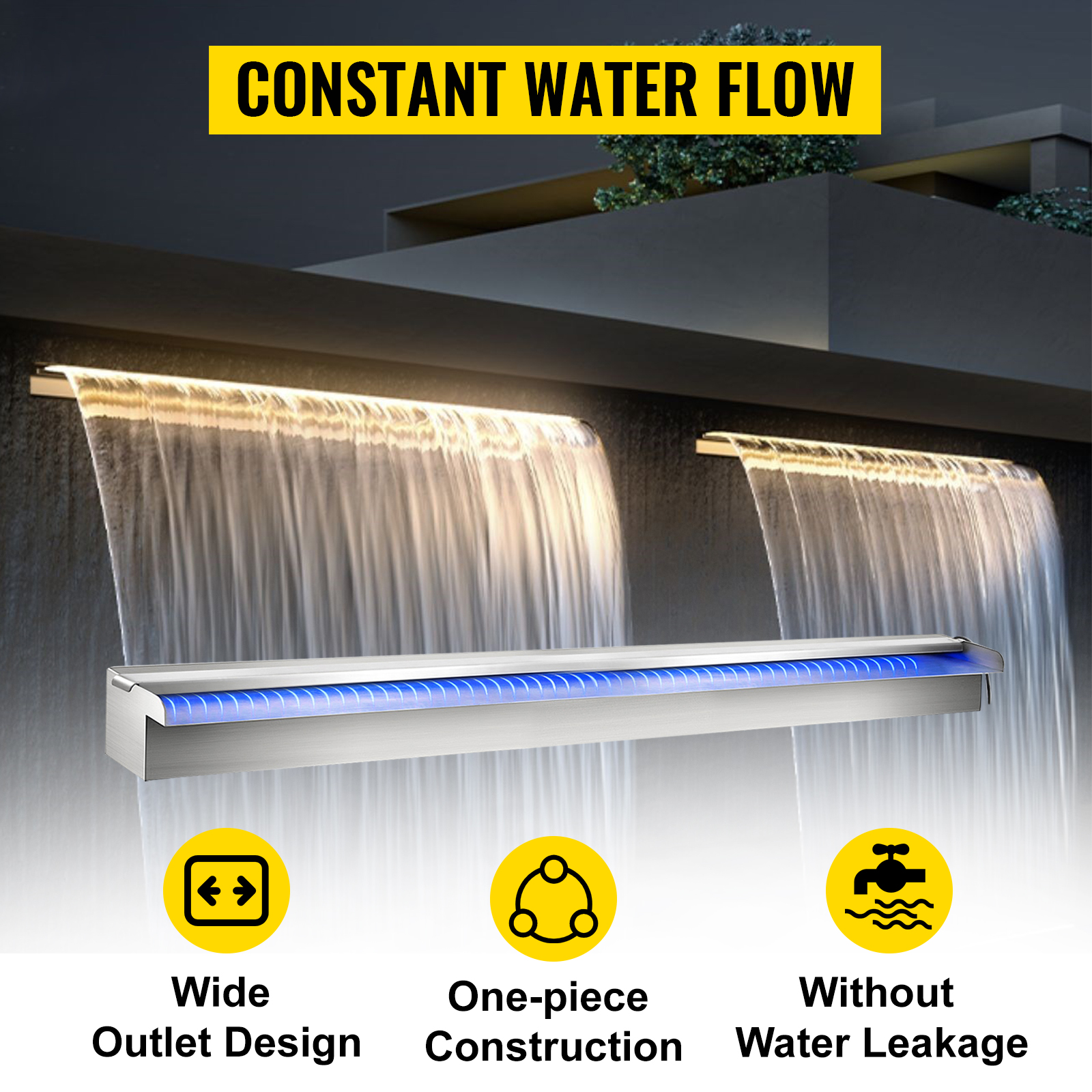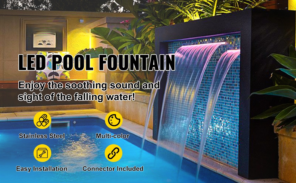 Tämä 151 cm leveä ruostumattomasta teräksestä valmistettu vesiputoussuihkulähde luo tasaisen, rauhoittavan vesiverhon uima-altaaseen, lampeen tai puutarhan vesiaiheeseen. Monivärinen LED-valonauha ja kaukosäädin tuovat valotehosteet iltoihin, ja kestävä rakenne soveltuu ulkokäyttöön sääolosuhteet huomioiden. Talvikaudella suositellaan olosuhteiden mukaista suojausta tai säilytystä.