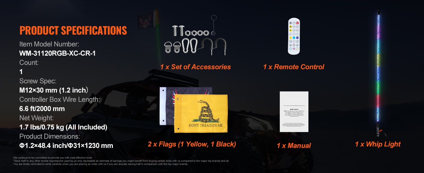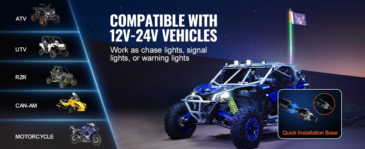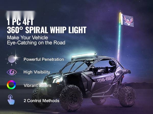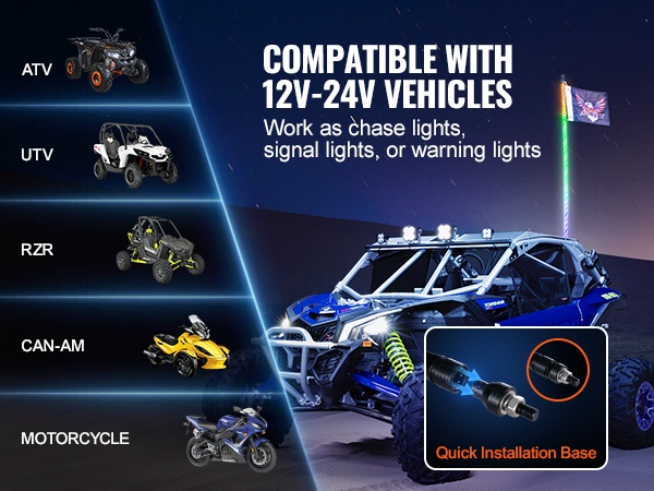 Whip-valot sopivat DC12V-24V ajoneuvoihin, kuten UTV:t, ATV:t, moottoripyörät, RZR:t, Can-am-ajoneuvot, lava-autot, off-road-ajoneuvot ja karting-autot. Näkyvyys paranee pimeällä ja maastoajossa, ja ajoneuvo erottuu selkeästi ympäristöstään.