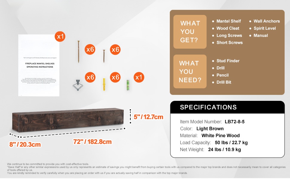 Seinäasennettava leijuva takkahylly valkoista mäntypuuta rustiikin ruskea 22,7 kg kantavuus