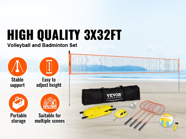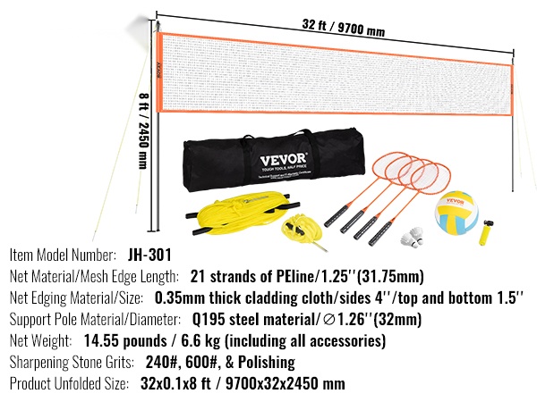 Verkon koko on 3x32 ft, ja se on valmistettu 21 PE-langan yhdistelmästä. Paksu 0.35mm verhoilukangas reunoilla parantaa ulkonäköä ja kestävyyttä sekä suojaa verkkoa kosteudelta ja auringonvalolta. Tämä tekee verkosta sopivan pitkäaikaiseen ulkokäyttöön sulkapallon ja lentopallon pelaamisessa.