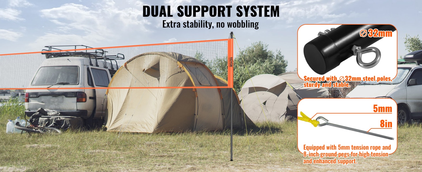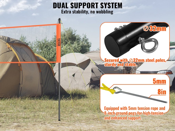 Verkkoa tukevat 32 mm terästangot pitävät rakenteen tukevana. 5mm kiristysköydet ja 8-tuumaiset maakiilat lisäävät jännitystä ja tukea, jotta verkko pysyy suorassa ja vakaana myös aktiivisen pelin aikana.