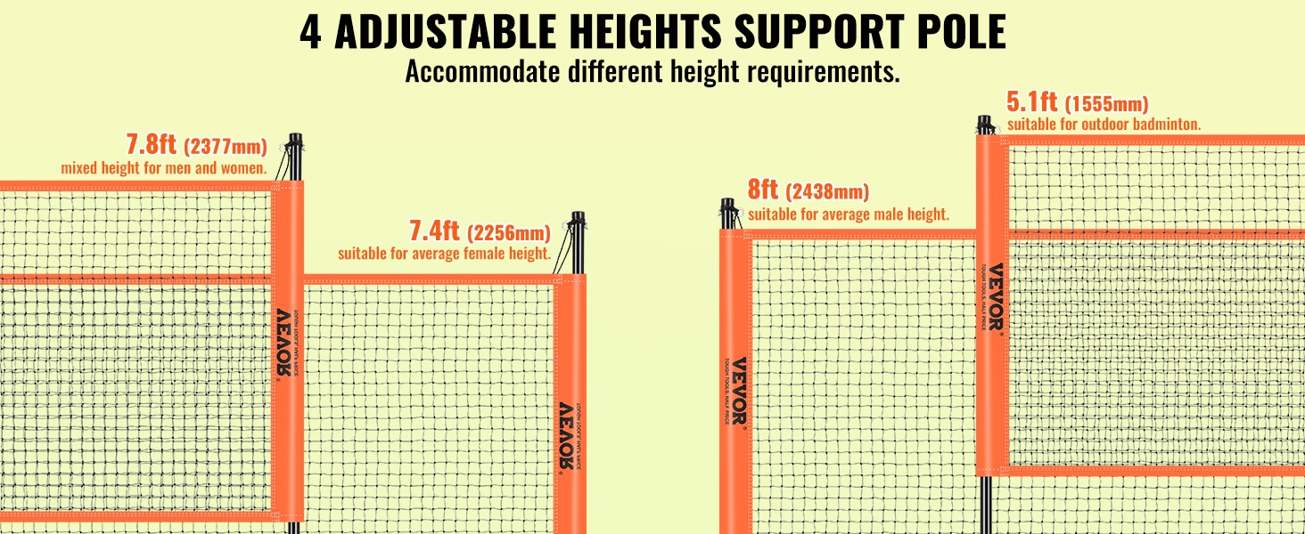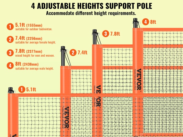 Tukitangot tarjoavat neljä korkeussäätöä: 5.1 ft (1555 mm), 7.4 ft (2256 mm), 7.8 ft (2377 mm) ja 8 ft (2438 mm). Näin sama verkko sopii sekä sulkapalloon että lentopalloon ja erilaisille pelaajille.