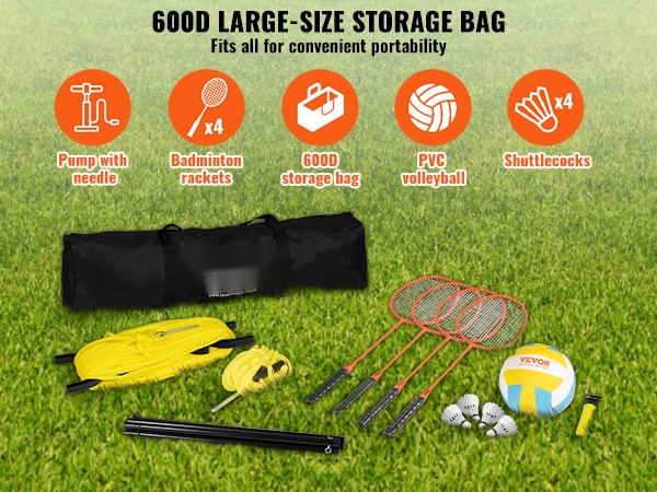 Säilytyslaukun koko on 35.5"x6"x9", ja siihen mahtuvat verkko, tangot sekä muut tarvikkeet. Laukku helpottaa siirtämistä pihan, rannan ja muiden pelipaikkojen välillä ja pitää setin osat koottuna samassa paikassa.