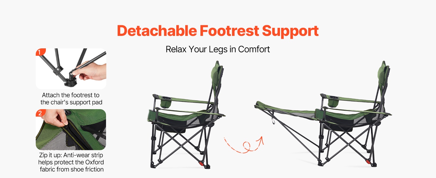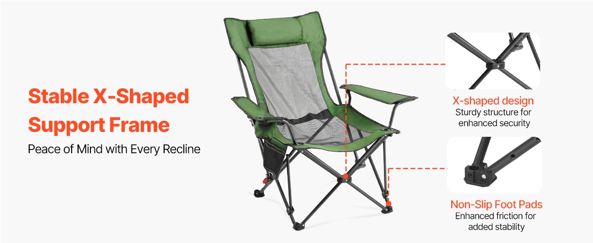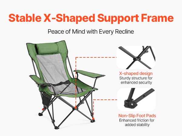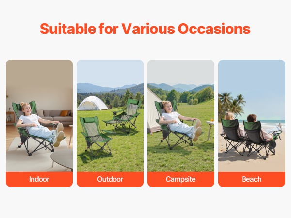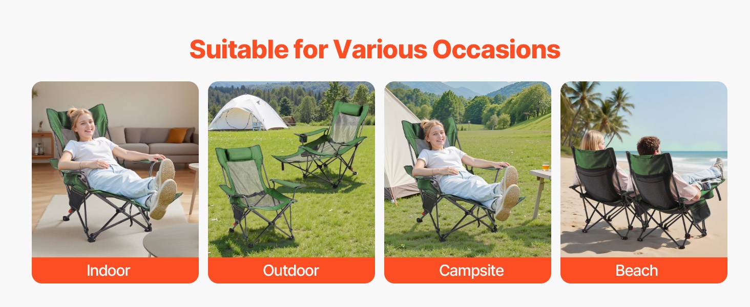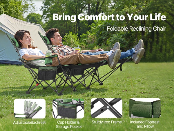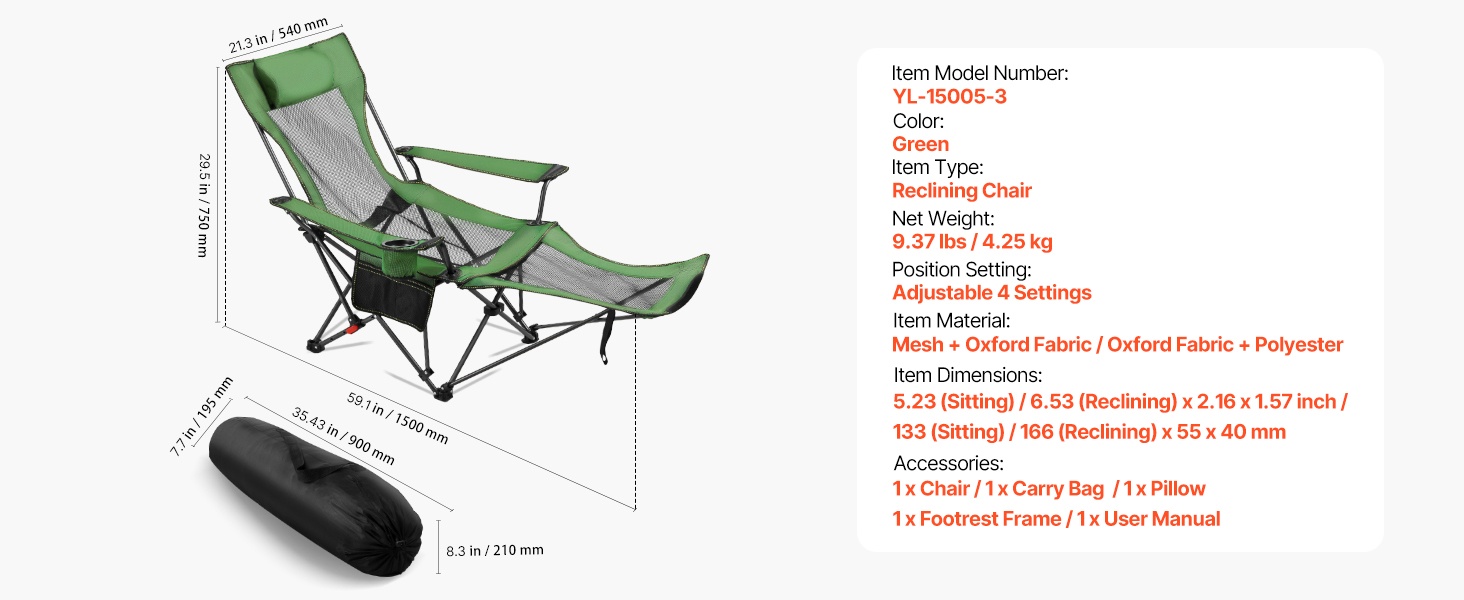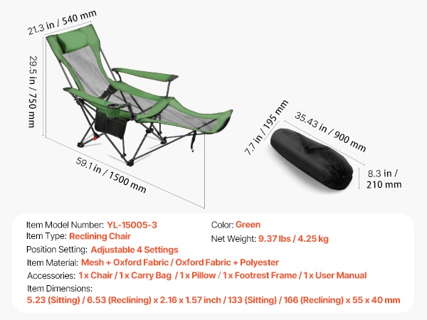 Taitettava lepotuoli tarjoaa mukavan istuma- ja lepoasennon ulkona ja sisällä. Tuolin mitat ovat 52.36 (istuma-asento) / 65.35 (lepotila) x 21.65 x 15.75 tuumaa / 133 (istuma-asento) / 166 (lepotila) x 55 x 40 cm, joten tilaa on riittävästi rentoutumiseen. Vahva rautarunko kestää jopa 220 lbs kuormituksen. Selkänojan 4-portainen säätö auttaa vähentämään hartioiden, niskan ja käsivarsien rasitusta esimerkiksi leiriytyessä tai terassilla levätessä.