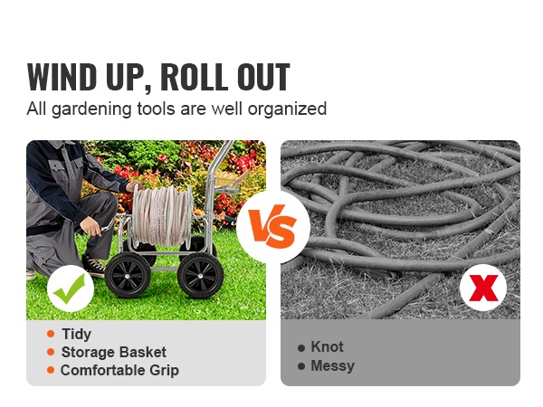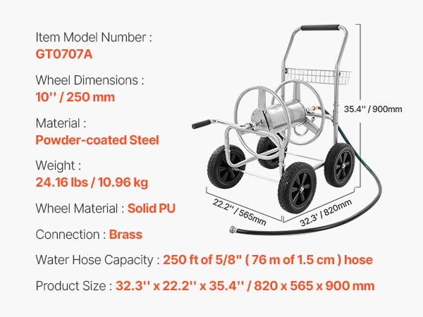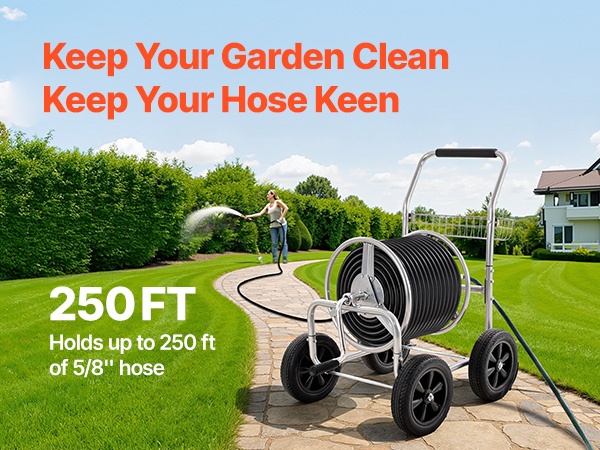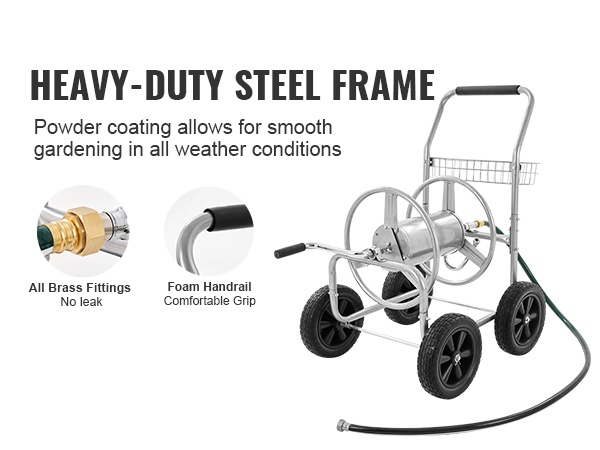 Tämä letkukelavaunu on valmistettu Q235A-teräksestä ja varustettu messinkisillä liittimillä. Se soveltuu jopa 230 ft (7010.4 cm) pitkälle 1/2" (12.7 mm) letkulle tai 175 ft (5334 cm) pitkälle 5/8" (15.88 mm) letkulle. Hammasrataskäyttöinen kelamekanismi helpottaa letkun sisäänkelautumista, ja matala painopiste sekä pitävät pyörät pitävät vaunun vakaana nurmikolla, soralla tai epätasaisella maalla.