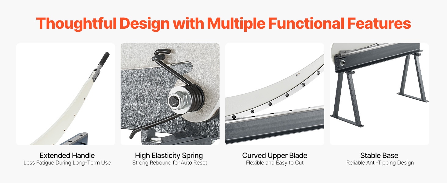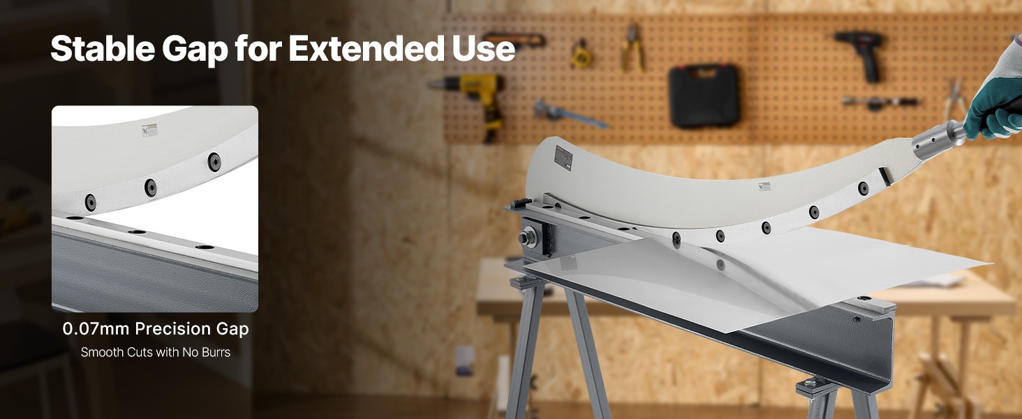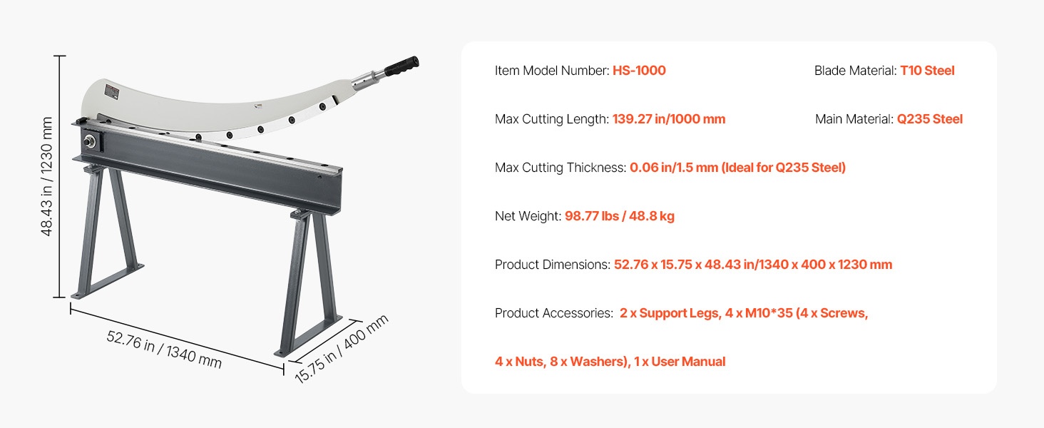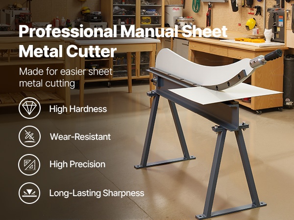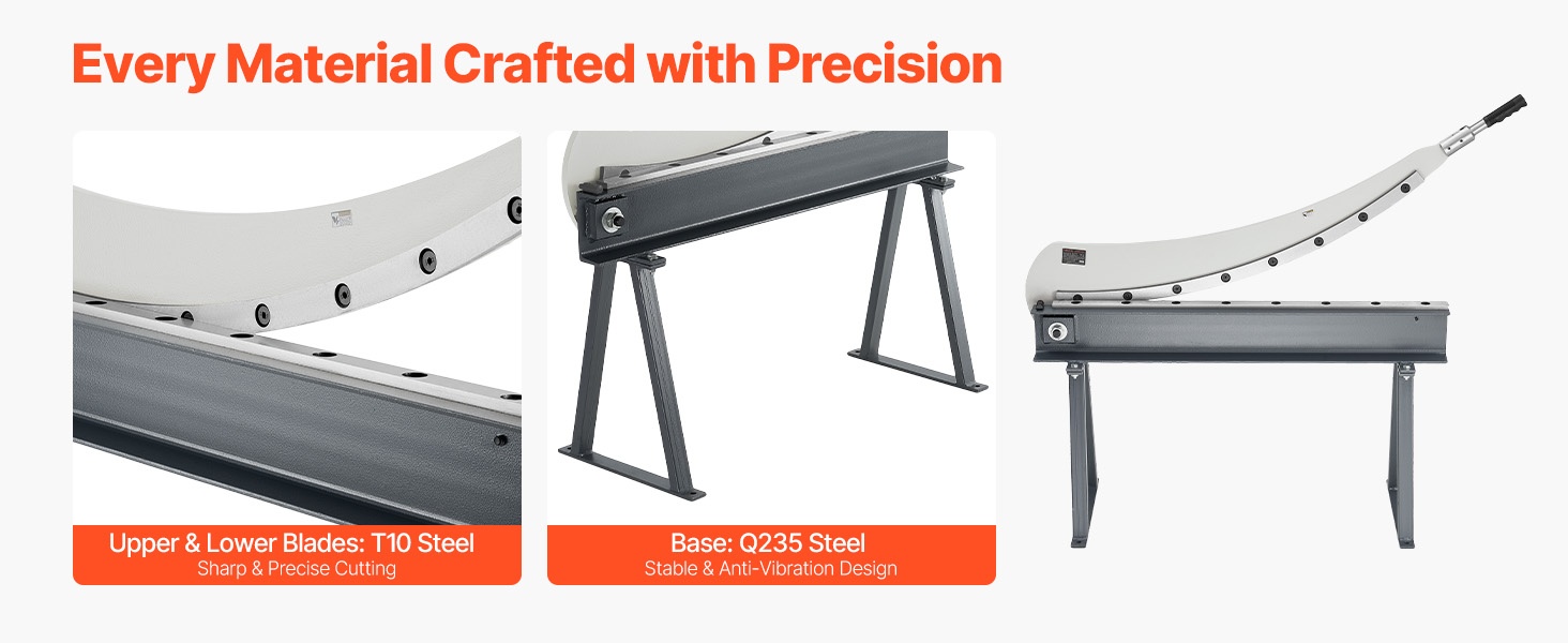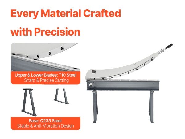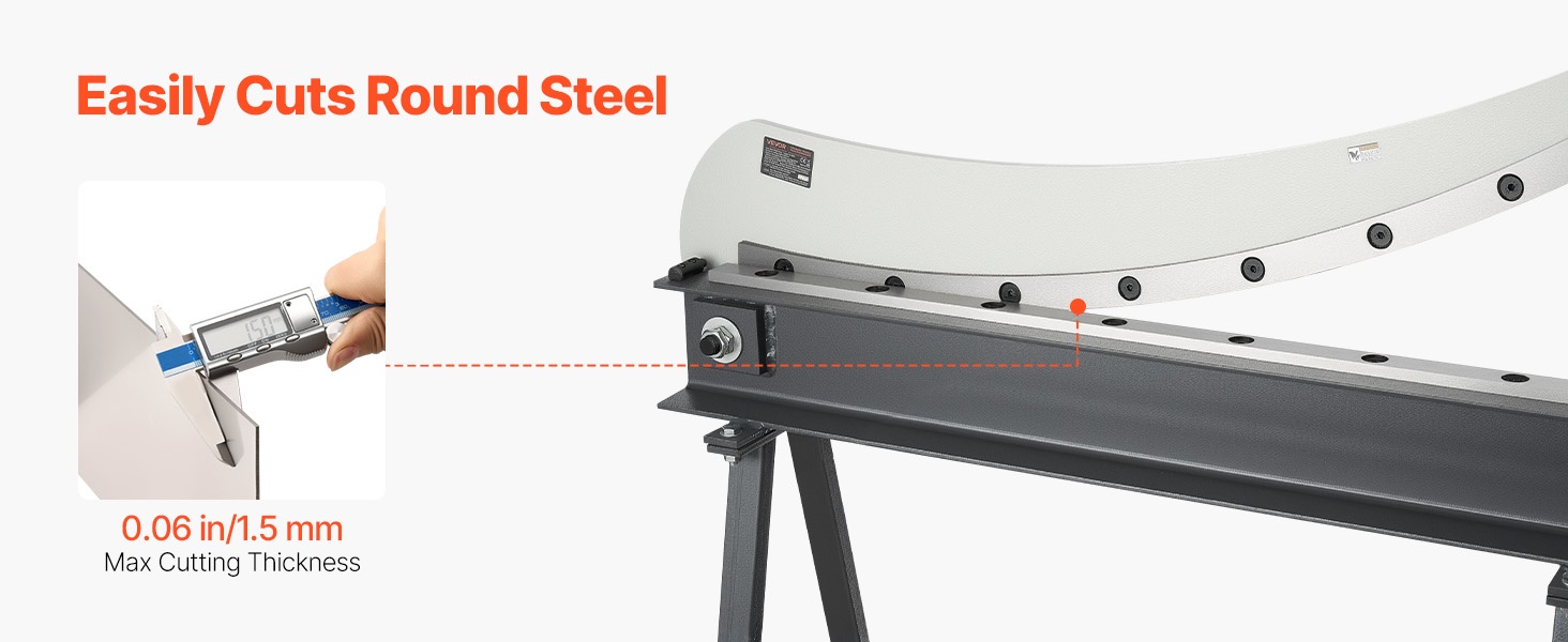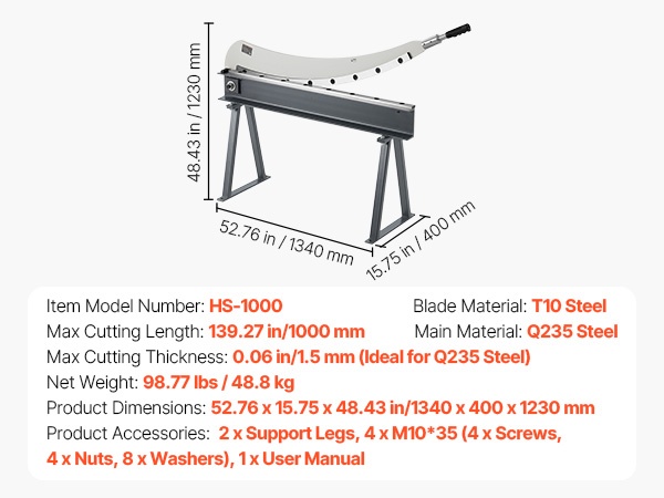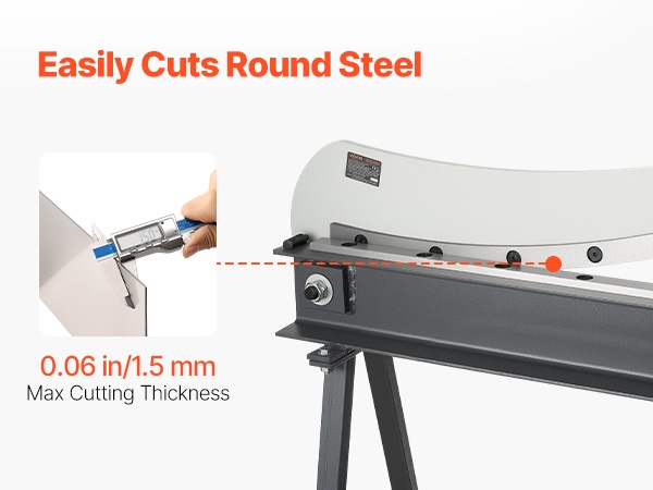 Tämä levyleikkuri on suunniteltu alumiinin, ruostumattoman teräksen ja vähähiilisen teräksen leikkaamiseen. Siinä on T10-teräksestä valmistetut terät ja pyöröterä. Suurin leikkauspituus on 39.27 in, leikkauspaksuus 0.06 in ja pyöröteräksen kapasiteetti 0.06 in. Alle 0.07 mm terävälys varmistaa tarkat ja siistit leikkaukset ilman purseita.