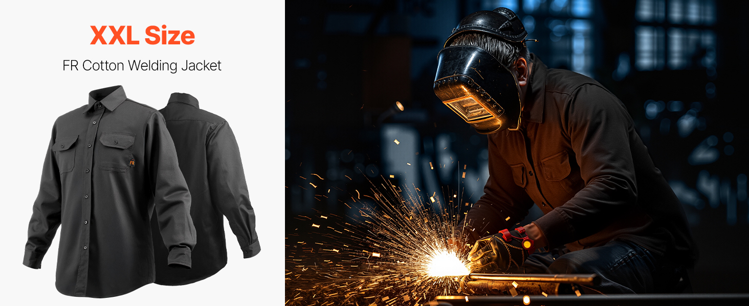 Liekinkestävä hitsaustakki XXL, 7 oz FR-puuvilla, konepestävä, ATPV 9.2 Cal/cm², säädettävät hihansuut ja taskut