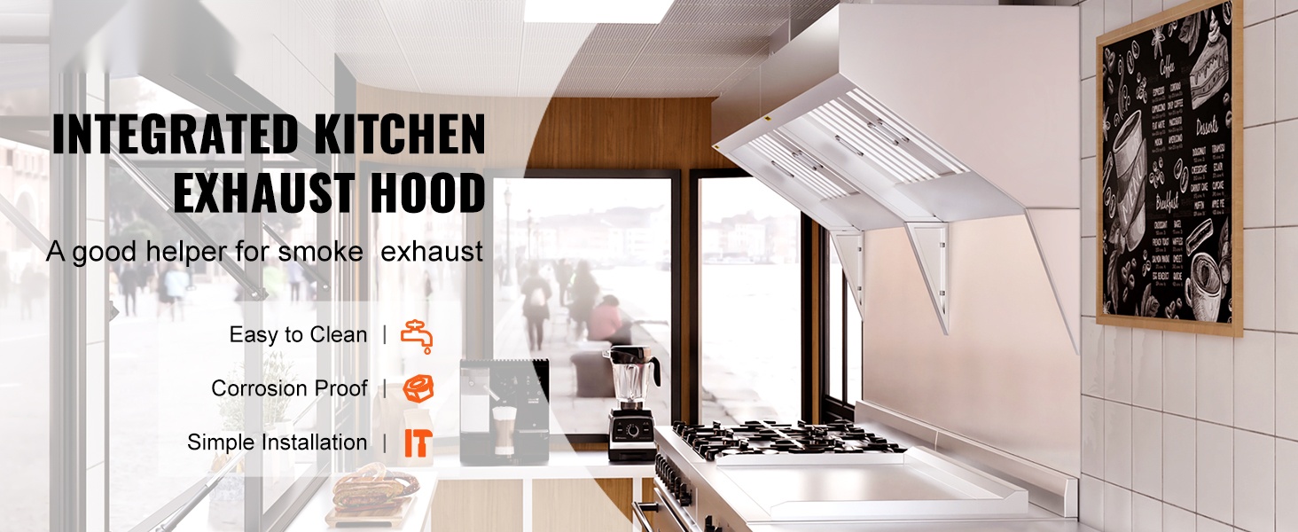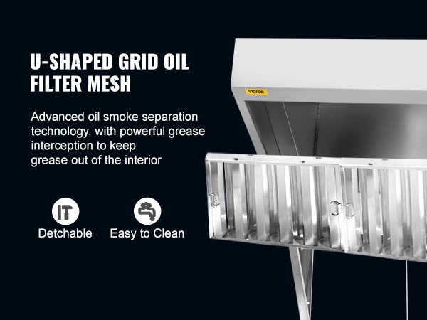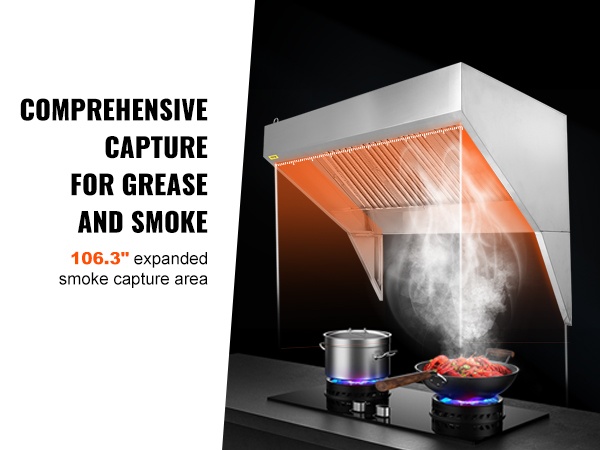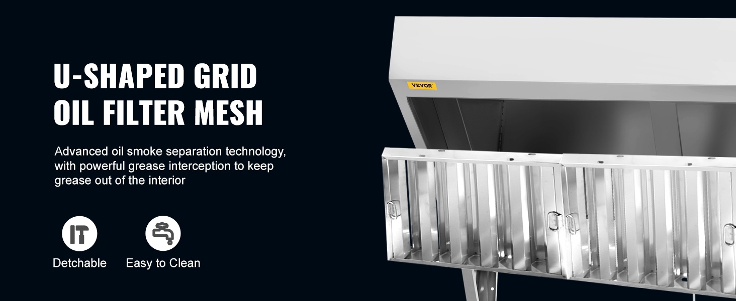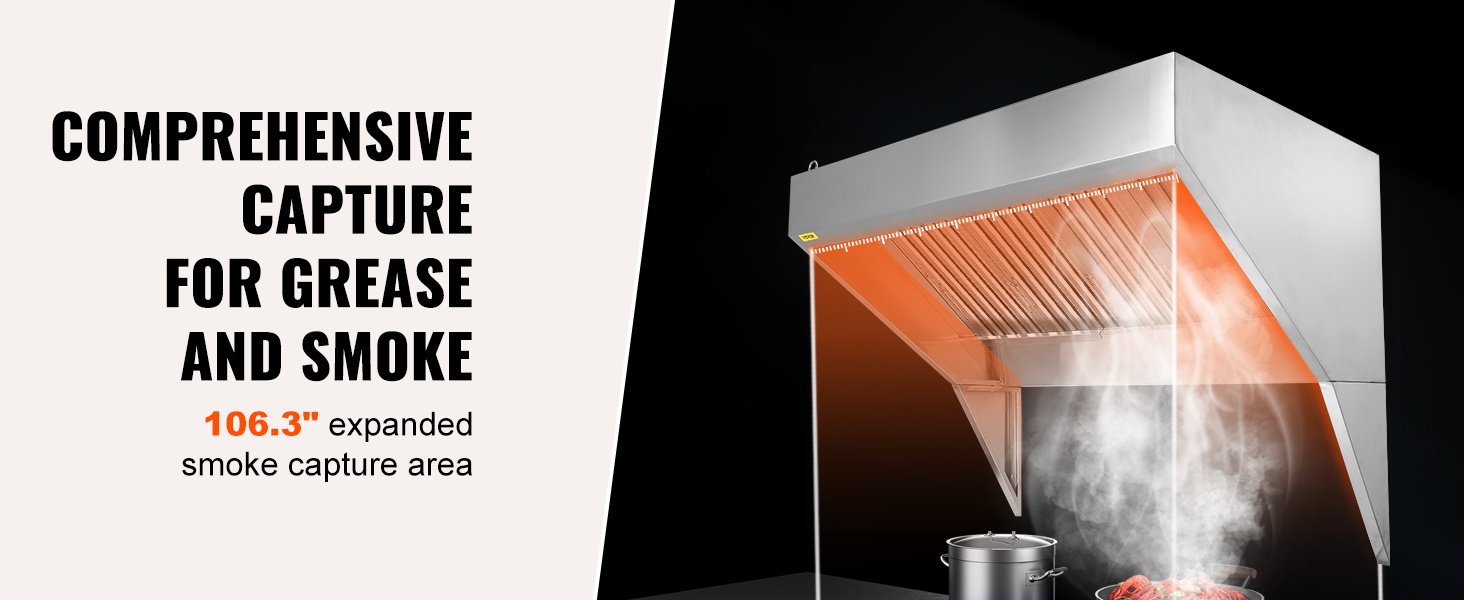 Tämä 2.74 m leveä kaupallinen liesikupu on suunniteltu erityisesti ruokarekoihin, myyntikärryihin ja ammattikeittiöihin. Suuri savun sieppausalue ja U-muotoiset öljysuodatinverkot auttavat pitämään työtilan raikkaana, vähentävät rasvahiukkasia ilmassa ja tekevät keittiöstäsi siistimmän ja miellyttävämmän.