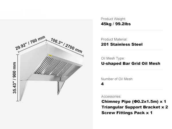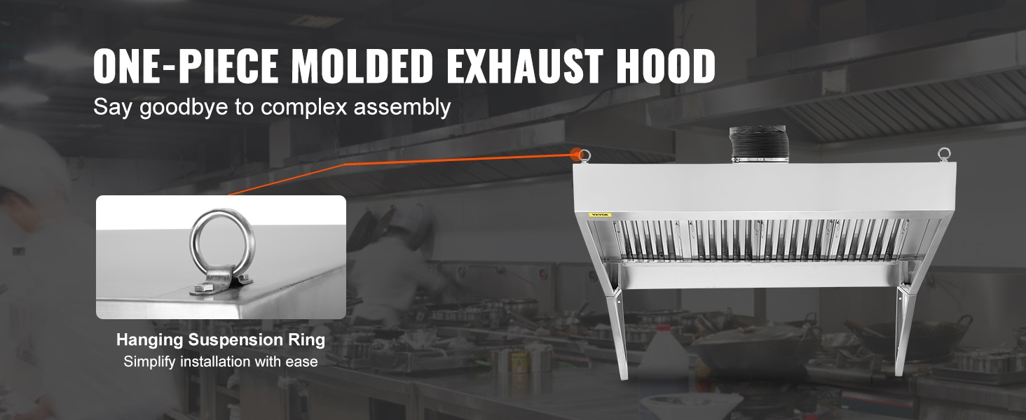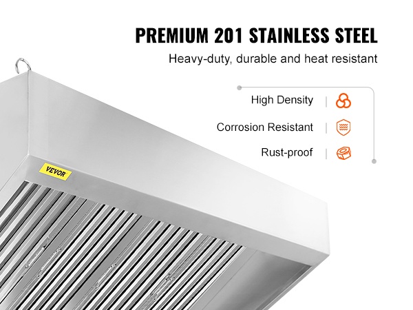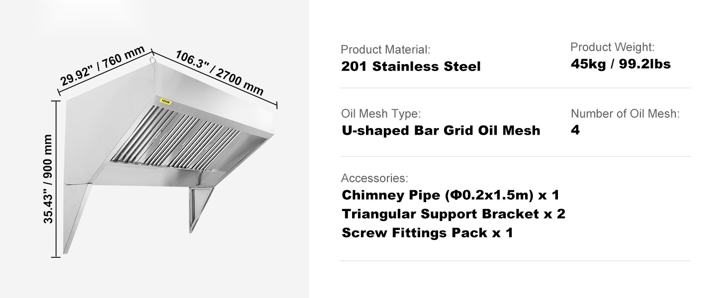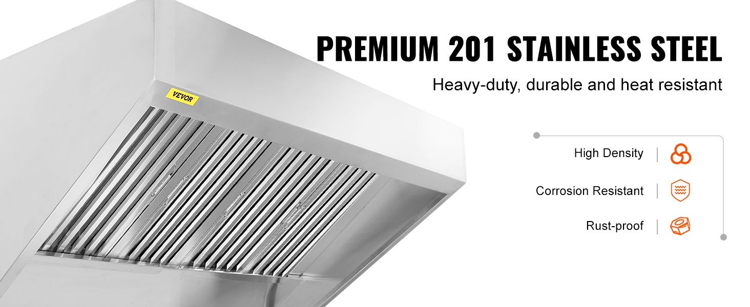 Tämä 2.74 m leveä kaupallinen liesikupu on suunniteltu erityisesti ruokarekoihin, myyntikärryihin ja ammattikeittiöihin. Suuri savun sieppausalue ja U-muotoiset öljysuodatinverkot auttavat pitämään työtilan raikkaana, vähentävät rasvahiukkasia ilmassa ja tekevät keittiöstäsi siistimmän ja miellyttävämmän.