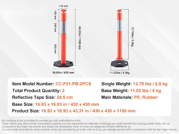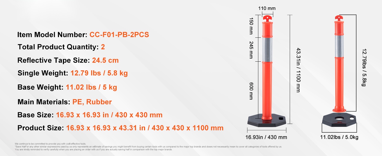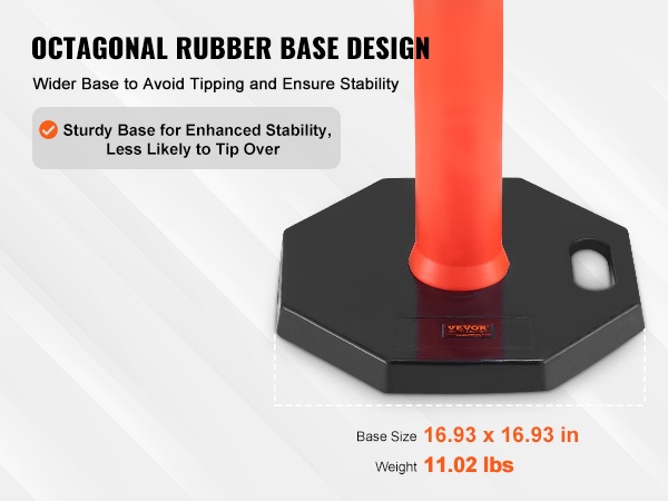 Tolpissa on levennetty kahdeksankulmainen kumipohja, jonka koko on 16.93 x 16.93 in / 430 x 430 mm ja paino 11.02 lbs / 5 kg. Vakaa pohja kestää ulkoisia voimia ja parantaa varoitusten tehokkuutta.