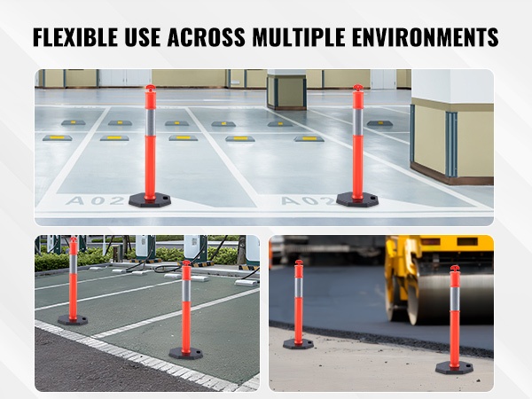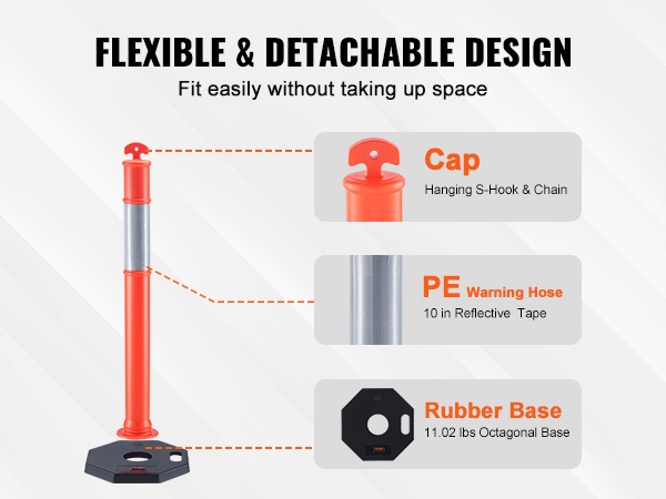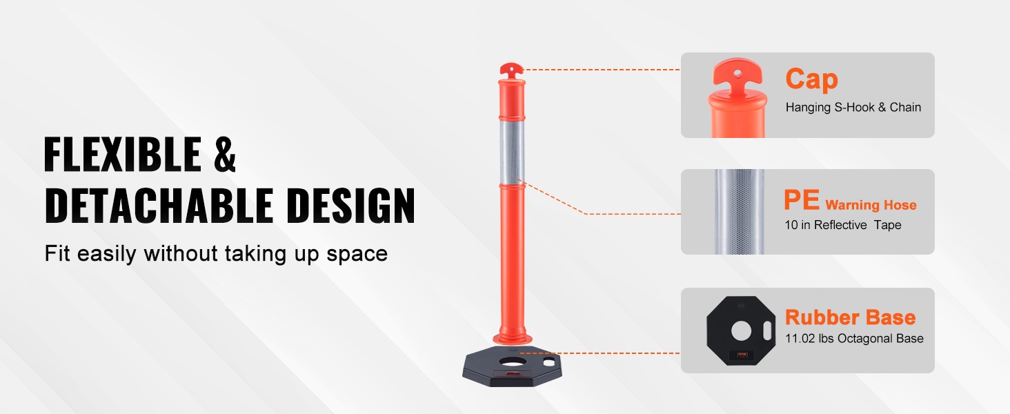 Nämä liikenteen ohjaustolpat erottuvat kirkkaalla turvavärillä ja 360° heijastinnauhoilla, jotka parantavat näkyvyyttä erityisesti pimeään aikaan ja tehostavat varoitusmerkintöjä. Irrotettava rakenne helpottaa säilytystä ja käyttöön ottamista.