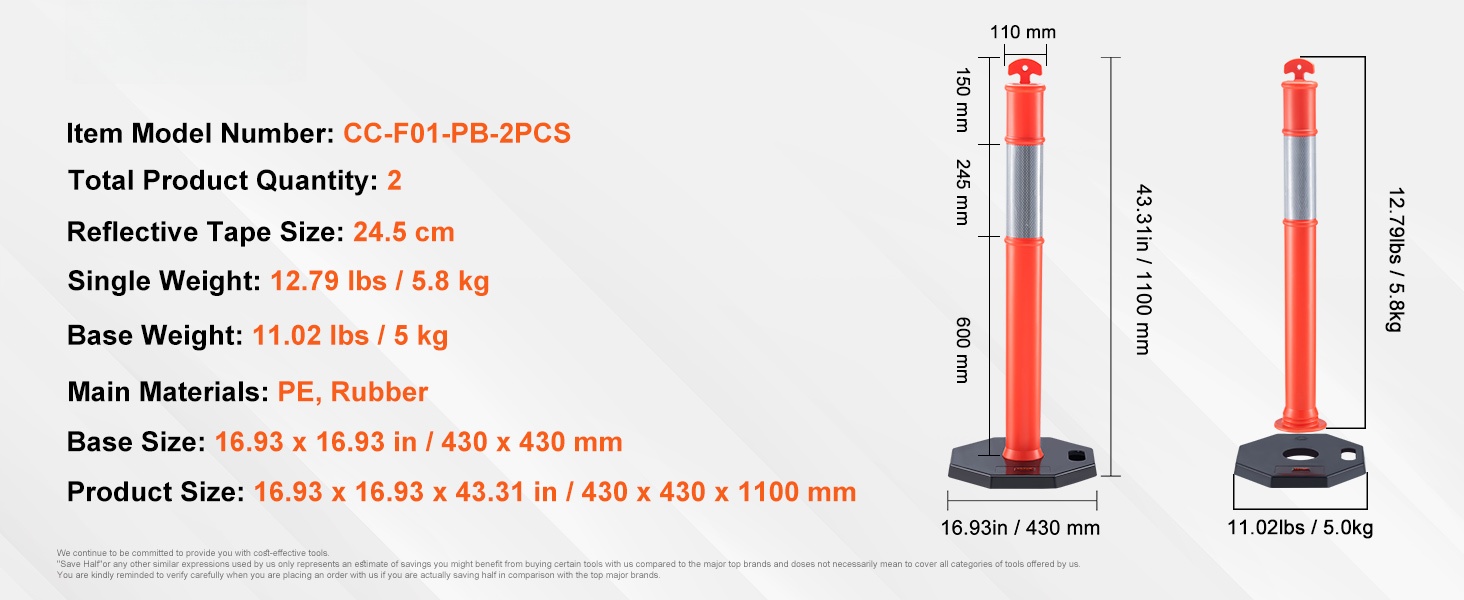 Liikenteen ohjaustolpat kumipohjalla 430 x 430 x 1100 mm 2 kpl CC-F01-PB-2PCS