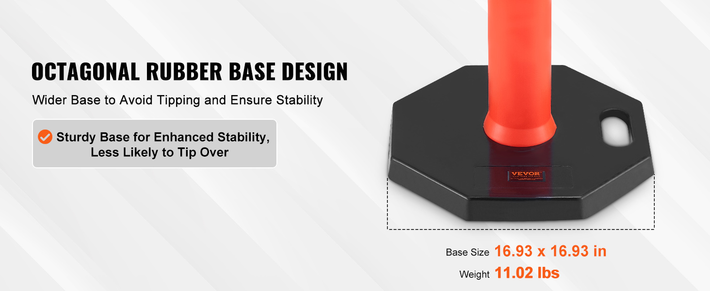 Tolpissa on levennetty kahdeksankulmainen kumipohja, jonka koko on 430 x 430 mm ja paino 5 kg. Vakaa pohja kestää ulkoisia voimia ja parantaa varoitusten tehokkuutta.