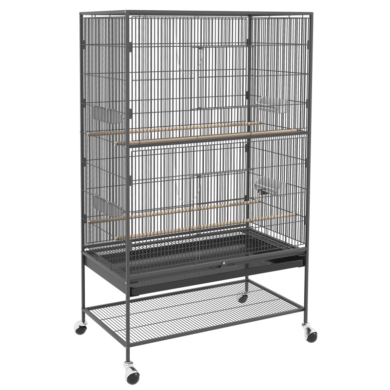 Lintuhäkki pienille linnuille telineellä, orret ja lelut, teräs, 94 x 57 x 153 cm, harmaa