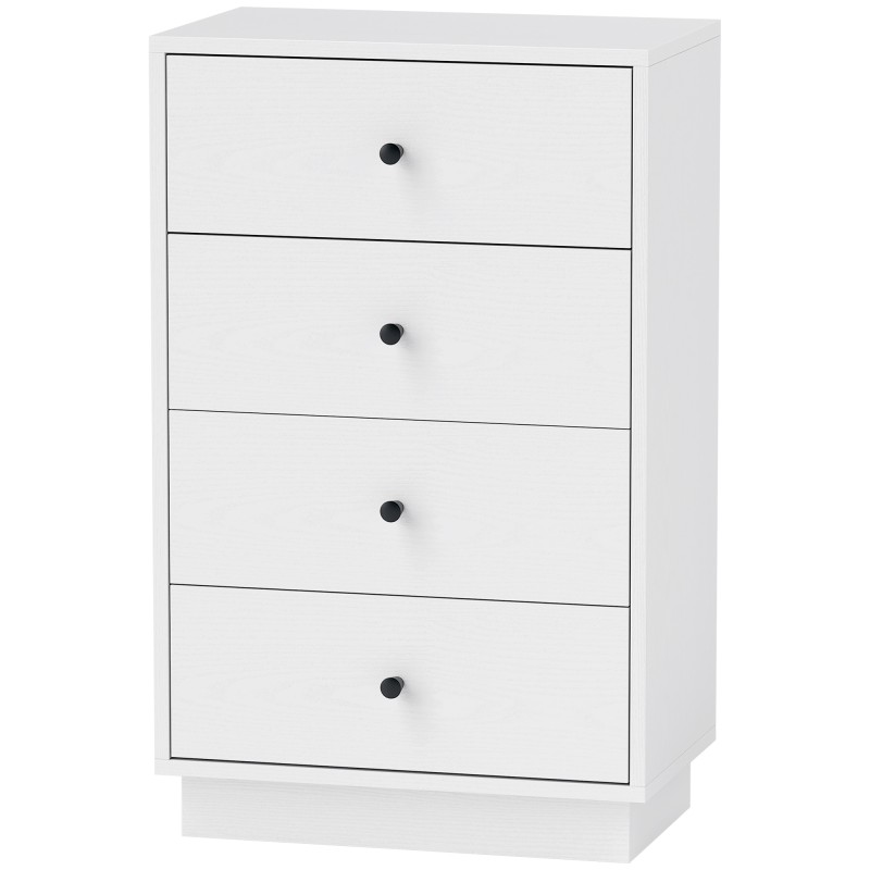 Tämä moderni, valkoinen lipasto auttaa pitämään arjen tavarat siististi järjestyksessä. Neljä tilavaa laatikkoa kätkevät vaatteet, asusteet ja muut käyttöesineet, ja yläosaan mahtuu sisustusesineitä, kasveja tai jokapäiväisiä tarvikkeita. Pelkistetty muotoilu ja mustat vetimet sopivat monenlaiseen sisustukseen ja tuovat tilaan raikkaan, nykyaikaisen ilmeen.