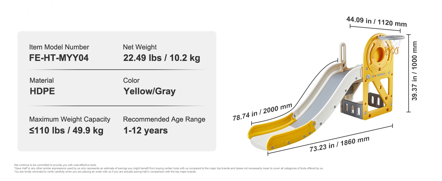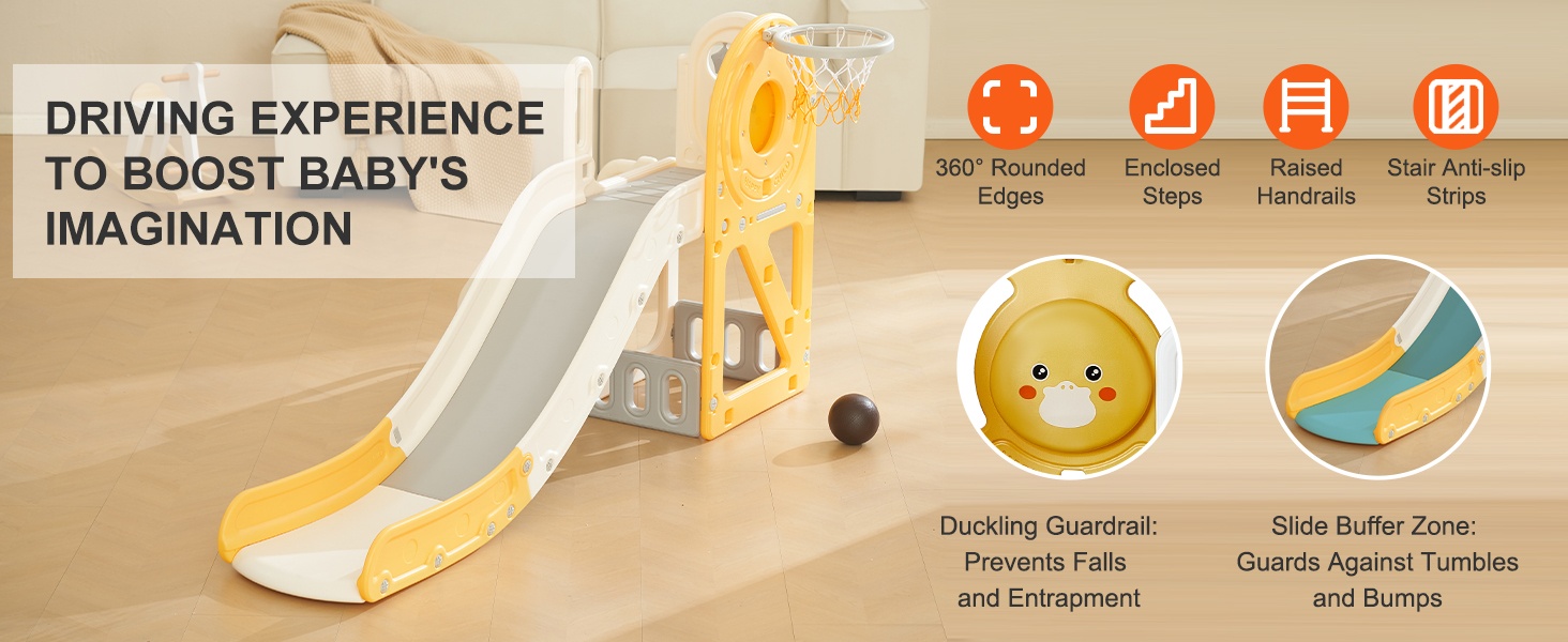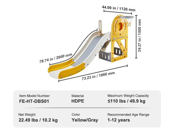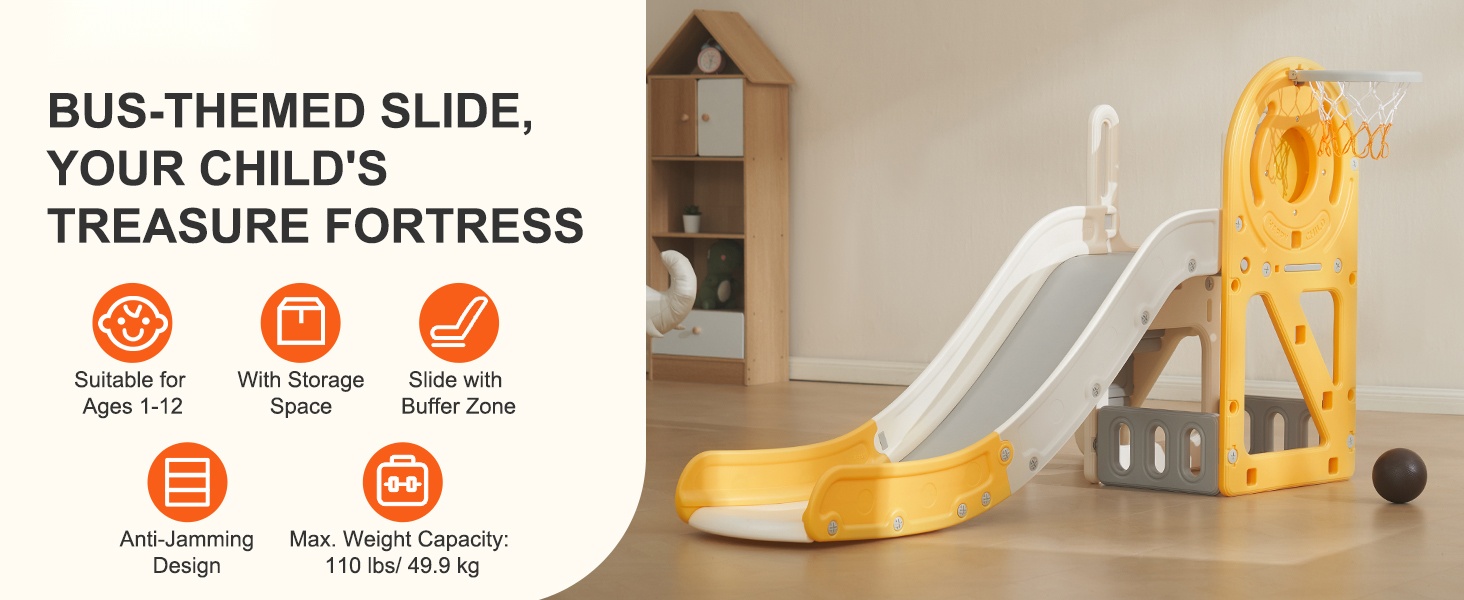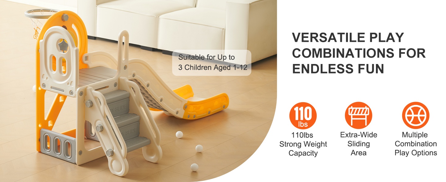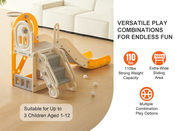 Liukumäki on valmistettu HDPE-muovista, ja siinä on pyöristetyt 360° reunat sekä liukumista estävät askelmat. Kolmiomainen rakenne pitää liukumäen tukevasti paikoillaan, jotta se ei pääse helposti kallistumaan tai kaatumaan käytössä. Mukana tulee myös korirengas ja koripallo, joten liukumäki tarjoaa monipuolisia leikkimahdollisuuksia.