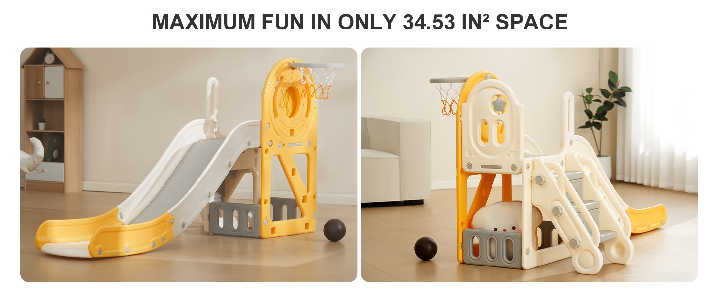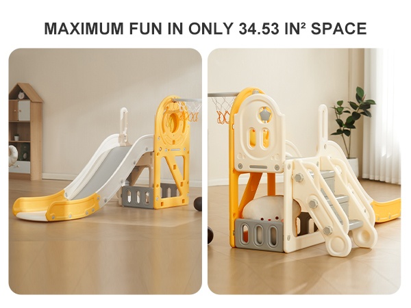 Liukumäki sopii hyvin lasten makuuhuoneeseen, leikkihuoneeseen tai olohuoneeseen. Pieni lattiatila riittää, jotta lapselle saa luotua oman turvallisen leikkikulman, jossa voi liukua ja harjoitella koripallon heittoa.