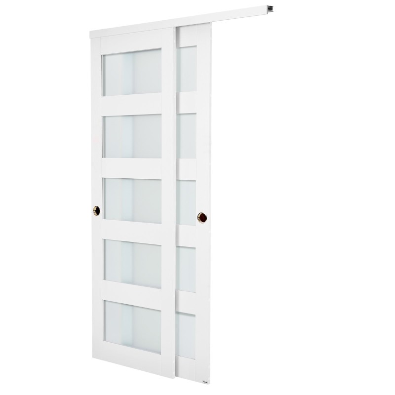 Tämä liukuovipaketti on suunniteltu vaatekomeroihin ja makuuhuoneisiin. Kahdesta ovipaneelista koostuva 5-ruutuinen, himmeästä lasista valmistettu liukuovi säästää tilaa ja päästää valoa läpi säilyttäen samalla yksityisyyden. Ovet liukuvat päällekkäin hiljaisesti ja pehmeästi, ja mukana tuleva lattiaohjain pitää ne vakaasti linjassa. Ovissa on upotettu, helppokäyttöinen vedin, ja pinnan vedenkestävä PVC-pinnoite helpottaa puhdistusta ja lisää käyttöikää.