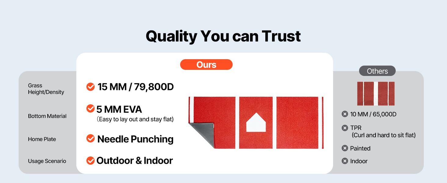 Matossa on 5mm EVA‑pohja, joka lisää kitkaa, vähentää liukastumisriskiä ja suojaa lattioita naarmuilta ja vaurioilta. Matto sopii sekä nopeisiin että hitaisiin syöttöharjoituksiin ja on monipuolinen apuväline baseball-harjoitteluun.