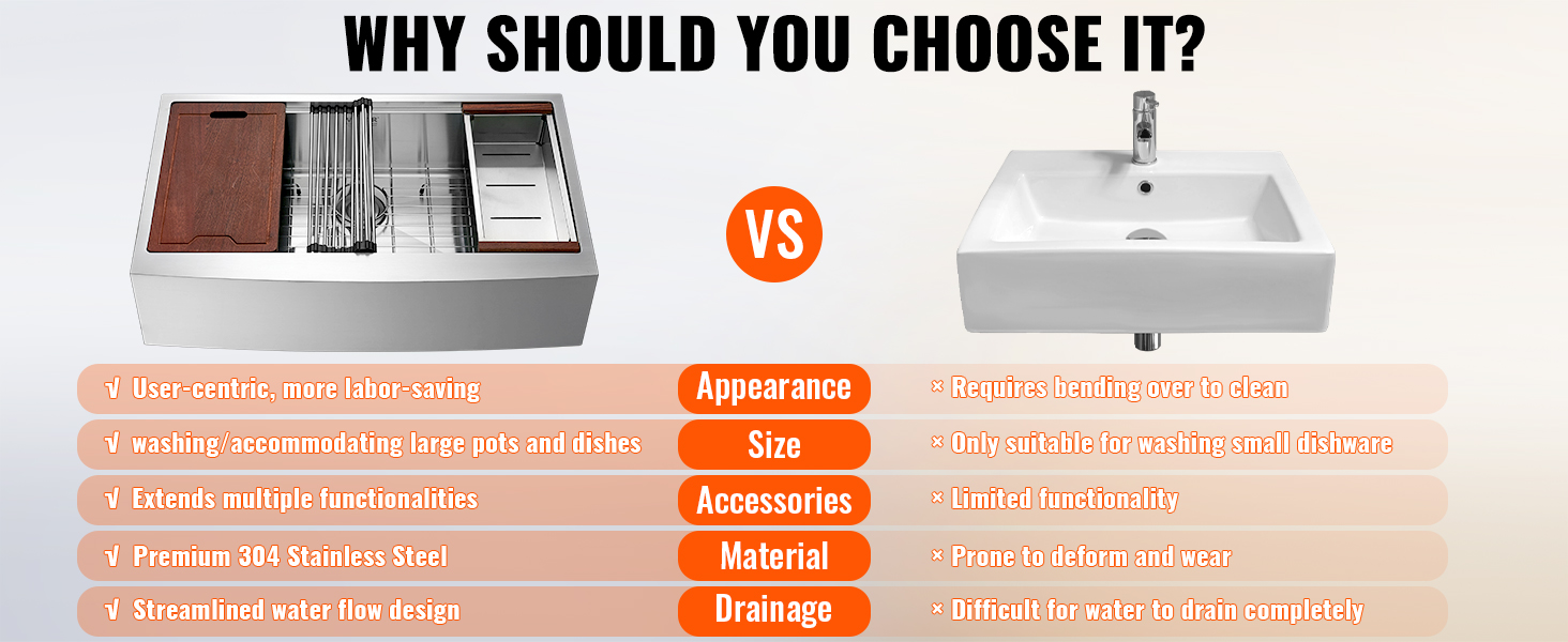 Tämä käytännöllinen ja tyylikäs monitoiminen maalaistyylinen keittiöallas lisää keittiösi esteettisyyttä ja tekee tiskaamisesta ja ruoanvalmistelusta sujuvampaa. Altaan reunoille sijoitettu taso mahdollistaa lisätarvikkeiden käytön suoraan altaan päällä, mikä säästää työtasotilaa.
