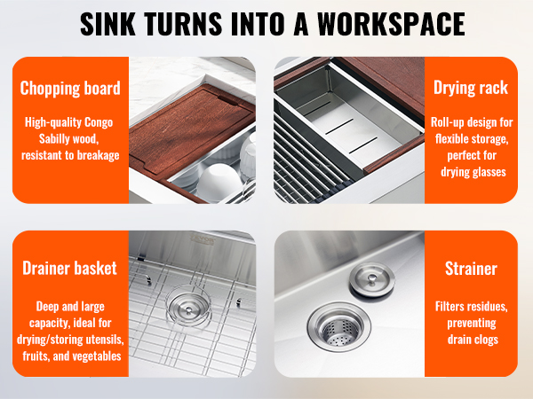 Pakkaukseen sisältyy runsaasti lisävarusteita, joita voi siirtää ja yhdistellä altaan porrastetulla rakenteella. Näin voit esimerkiksi pilkkoa ja valuttaa suoraan altaan päällä, ja samalla saat lisää hyödyllistä työtasotilaa ilman erillisiä leikkuulaustoja tai valutusastioita työtasolla.
