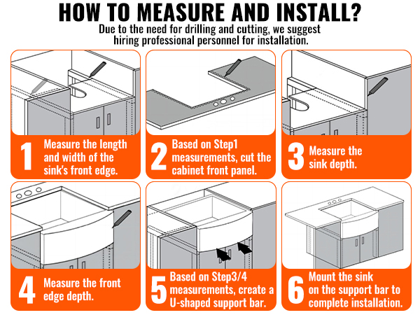 Mittaamis- ja asennusvaiheet on jaettu selkeisiin osiin, joita voi seurata kuvitettujen ohjeiden avulla. Näin altaan upotus ja kiinnitys onnistuvat sujuvasti, kun mitat ja työtaso ovat ohjeiden mukaiset.