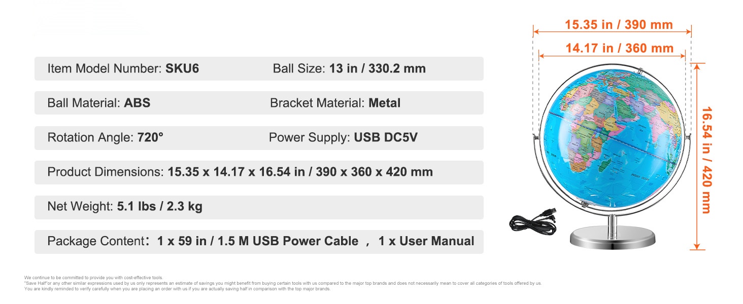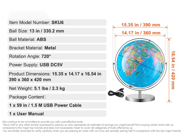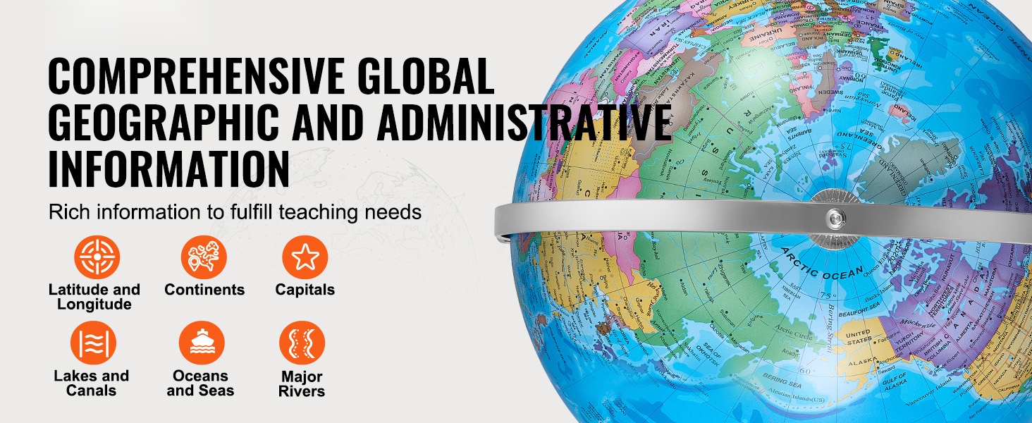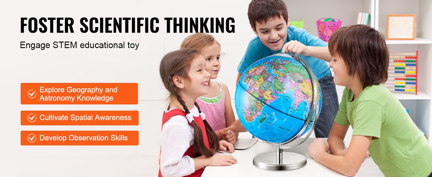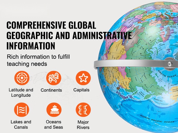 8 in /203.2 mm maapallo esittää maailman kartan ja rajat tarkasti. Teräväpiirtopainatus tekee rajoista ja nimilapuista helposti luettavia, jotta lapset voivat tutkia visuaalisesti eri maita, pääkaupunkeja, merivirtoja, järviä sekä leveys- ja pituuspiirejä. Se kattaa hyvin peruskouluikäisen maantiedon tarpeita.