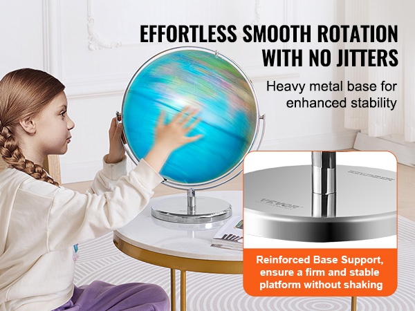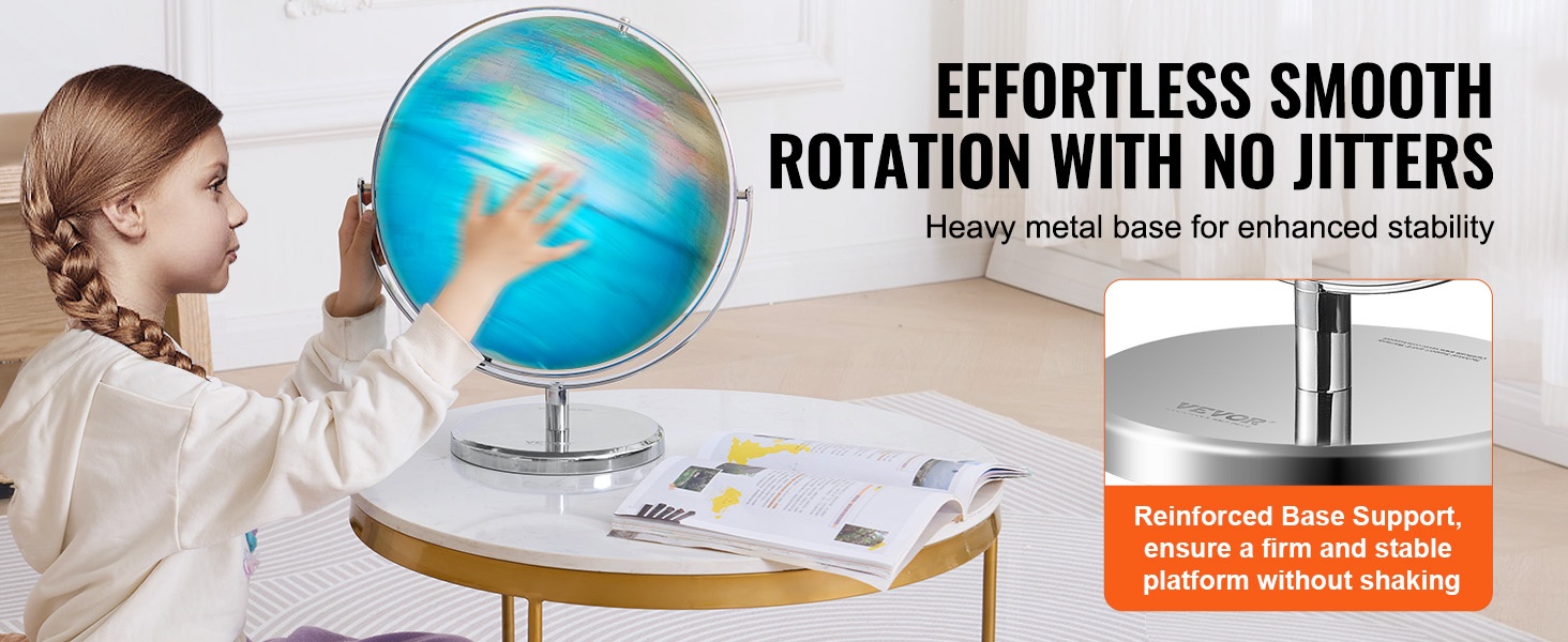 Huolellisesti valmistettu metallinen jalusta mahdollistaa 360° pyörimisen, jolloin maapalloa voi tarkastella vaivattomasti eri kulmista. Vakaa alusta vähentää horjumista verrattuna kevyempiin muovijalkoihin ja parantaa kestävyyttä ja käytön miellyttävyyttä.